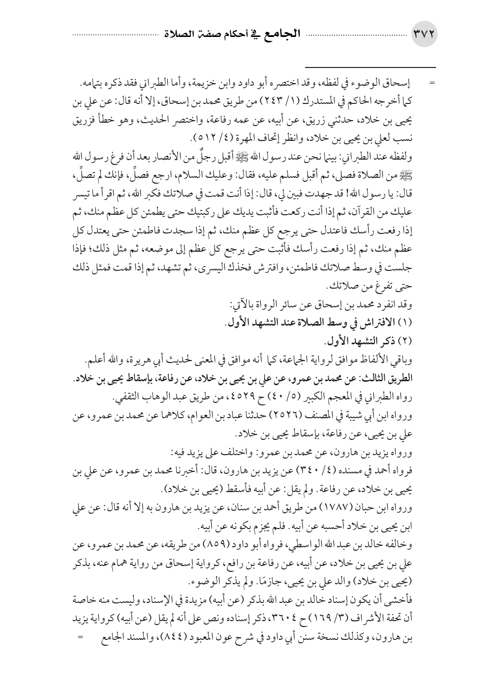 وخالفه خالد بن عبد الله الواسطي، فرواه أبو داود (٨٥٩) من طريقه، عن محمد بن عمرو، عن علي بن يحيى بن خلاد، عن أبيه، عن رفاعة بن رافع، كرواية إسحاق من رواية همام عنه، بذكر (يحيى بن خلاد) والد علي بن يحيى، جازمًا. ولم يذكر الوضوء.