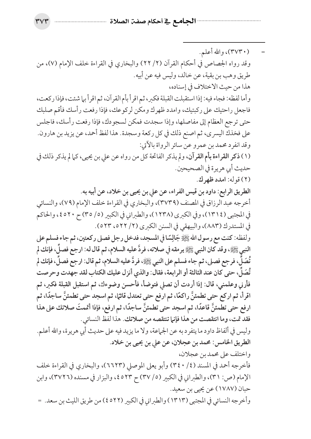 (١) ذكر القراءة بأم القرآن، ولم يذكر الفاتحة كل من رواه عن علي بن يحيى، كما لم يذكر ذلك في حديث أبي هريرة في الصحيحين.