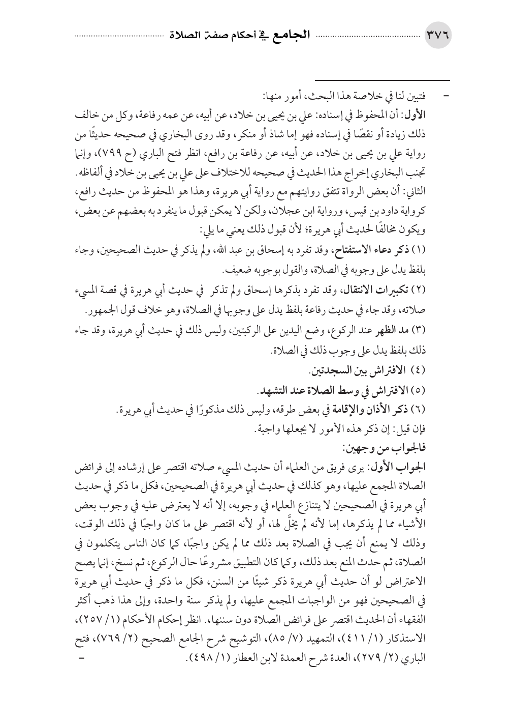 الجواب الأول: يرى فريق من العلماء أن حديث المسيء صلاته اقتصر على إرشاده إلى فرائض الصلاة المجمع عليها، وهو كذلك في حديث أبي هريرة في الصحيحين، فكل ما ذكر في حديث أبي هريرة في الصحيحين لا يتنازع العلماء في وجوبه، إلا أنه لا يعترض عليه في وجوب بعض الأشياء مما لم يذكرها، إما لأنه لم يخلَّ لها، أو لأنه اقتصر على ما كان واجبًا في ذلك الوقت، وذلك لا يمنع أن يجب في الصلاة بعد ذلك مما لم يكن واجبًا، كما كان الناس يتكلمون في الصلاة، ثم حدث المنع بعد ذلك، وكما كان التطبيق مشروعًا حال الركوع، ثم نسخ، إنما يصح الاعتراض لو أن حديث أبي هريرة ذكر شيئًا من السنن، فكل ما ذكر في حديث أبي هريرة في الصحيحين فهو من الواجبات المجمع عليها، ولم يذكر سنة واحدة، وإلى هذا ذهب أكثر الفقهاء أن الحديث اقتصر على فرائض الصلاة دون سننها،. انظر إحكام الأحكام (١/ ٢٥٧)، الاستذكار (١/ ٤١١)، التمهيد (٧/ ٨٥)، التوشيح شرح الجامع الصحيح (٢/ ٧٦٩)، فتح الباري (٢/ ٢٧٩)، العدة شرح العمدة لابن العطار (١/ ٤٩٨). =