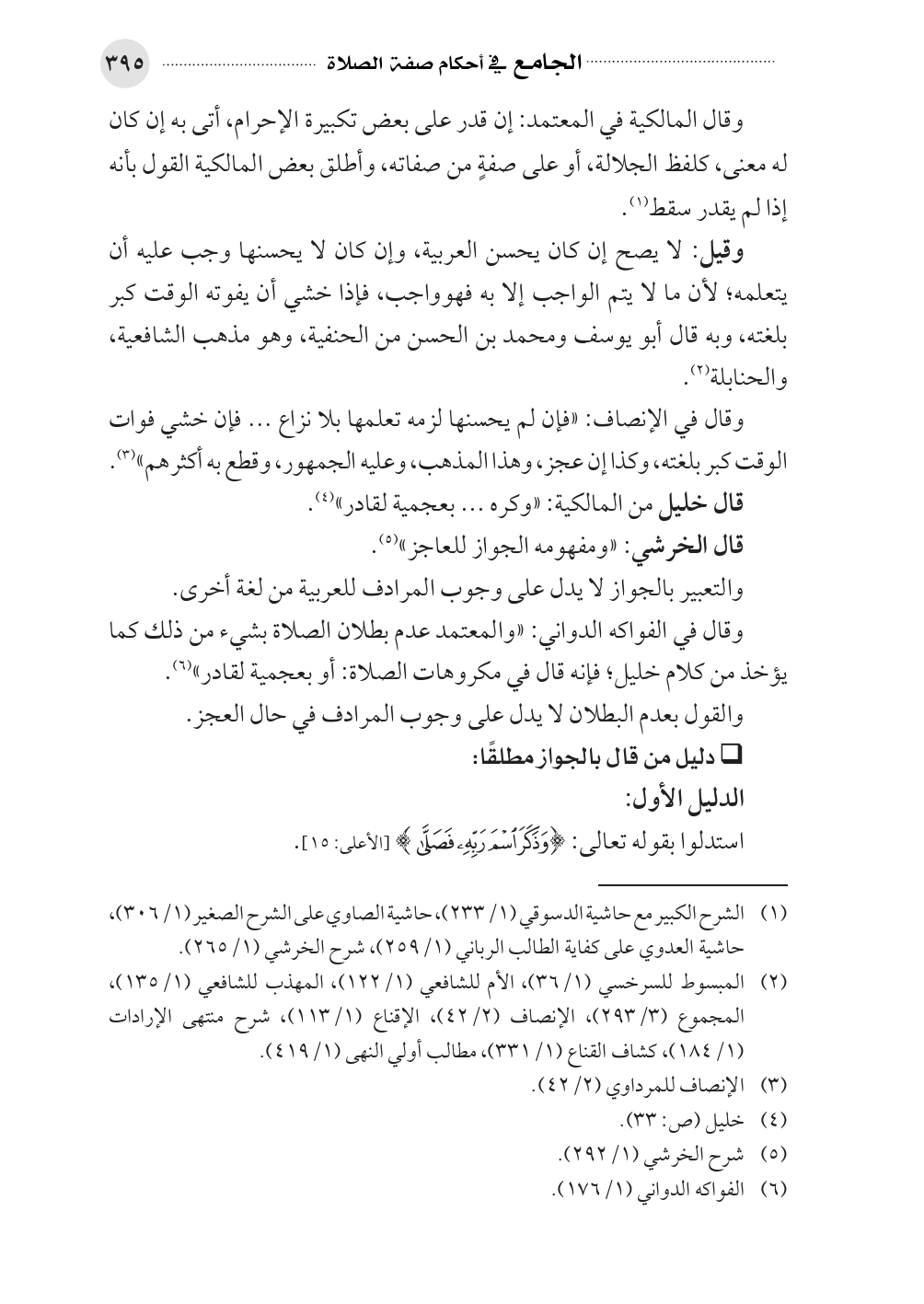 وقال في الفواكه الدواني: «والمعتمد عدم بطلان الصلاة بشيء من ذلك كما يؤخذ من كلام خليل؛ فإنه قال في مكروهات الصلاة: أو بعجمية لقادر» (¬٦).