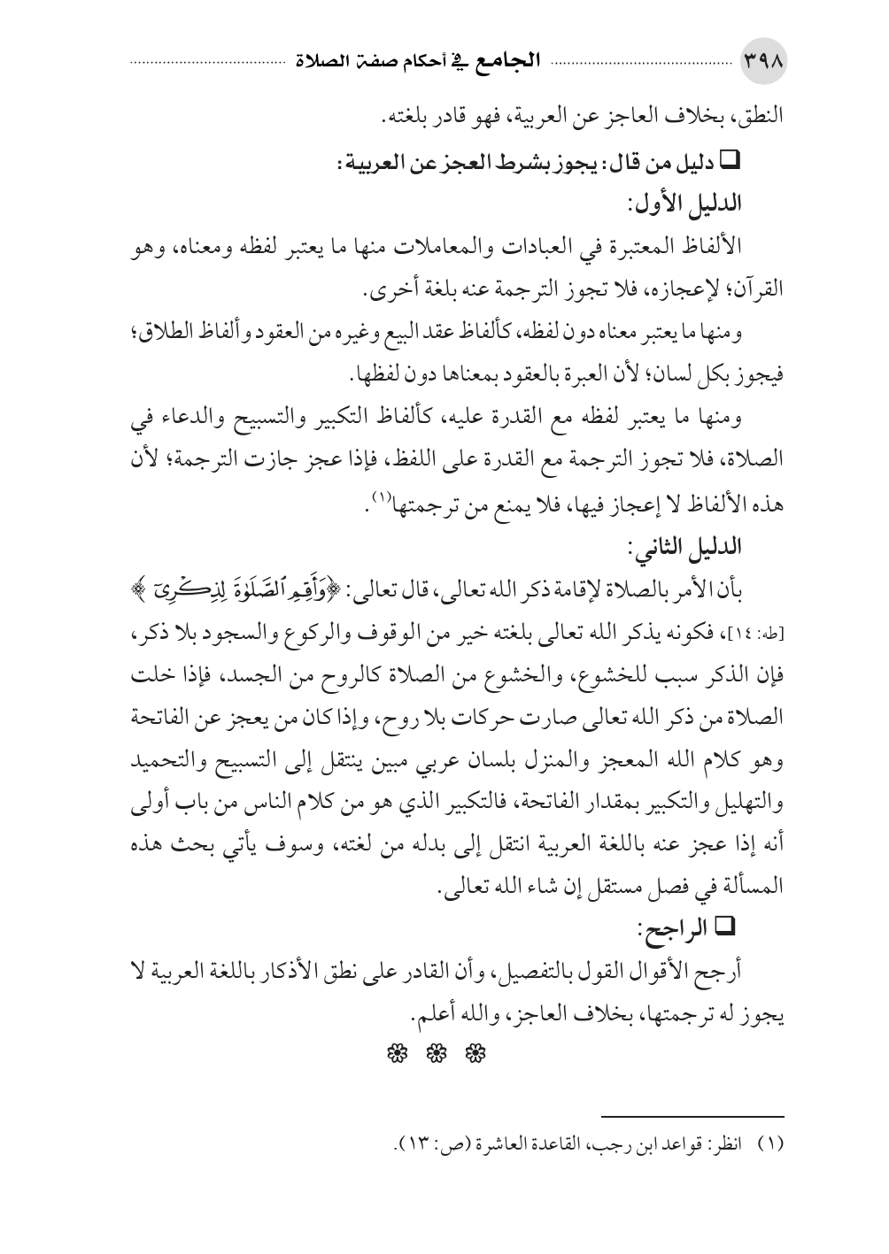 ومنها ما يعتبر لفظه مع القدرة عليه، كألفاظ التكبير والتسبيح والدعاء في الصلاة، فلا تجوز الترجمة مع القدرة على اللفظ، فإذا عجز جازت الترجمة؛ لأن هذه الألفاظ لا إعجاز فيها، فلا يمنع من ترجمتها (¬١).
