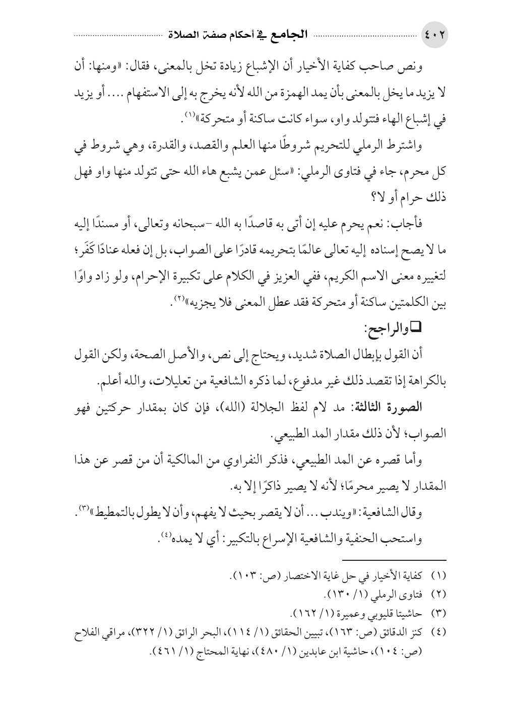 ونص صاحب كفاية الأخيار أن الإشباع زيادة تخل بالمعنى، فقال: «ومنها: أن لا يزيد ما يخل بالمعنى بأن يمد الهمزة من الله لأنه يخرج به إلى الاستفهام .... أو يزيد في إشباع الهاء فتتولد واو، سواء كانت ساكنة أو متحركة» (¬١).
