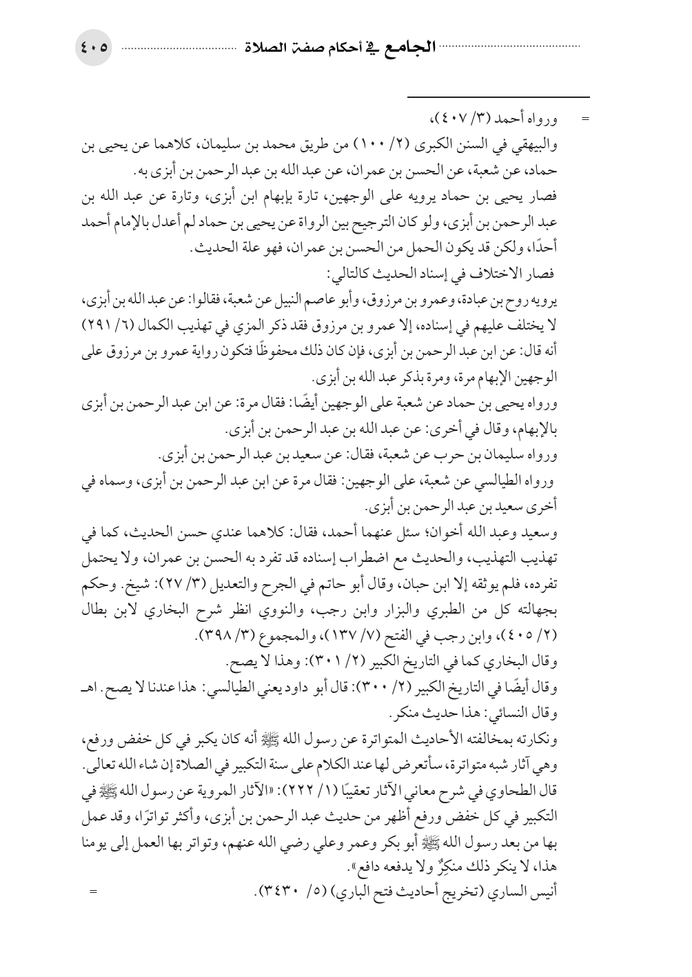 قال الطحاوي في شرح معاني الآثار تعقيبًا (١/ ٢٢٢): «الآثار المروية عن رسول الله صلى الله عليه وسلم في التكبير في كل خفض ورفع أظهر من حديث عبد الرحمن بن أبزى، وأكثر تواترًا، وقد عمل بها من بعد رسول الله صلى الله عليه وسلم أبو بكر وعمر وعلي رضي الله عنهم، وتواتر بها العمل إلى يومنا هذا، لا ينكر ذلك منكِرٌ ولا يدفعه دافع».