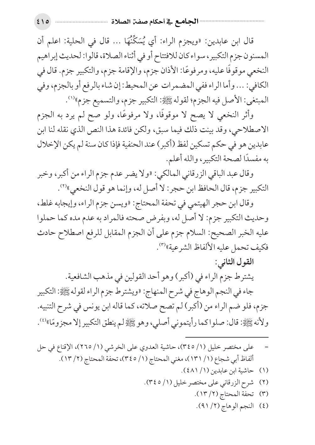 وقال ابن حجر الهيتمي في تحفة المحتاج: «ويسن جزم الراء، وإيجابه غلط، وحديث التكبير جزم: لا أصل له، وبفرض صحته فالمراد به عدم مده كما حملوا عليه الخبر الصحيح: السلام جزم على أن الجزم المقابل للرفع اصطلاح حادث فكيف تحمل عليه الألفاظ الشرعية» (¬٣).