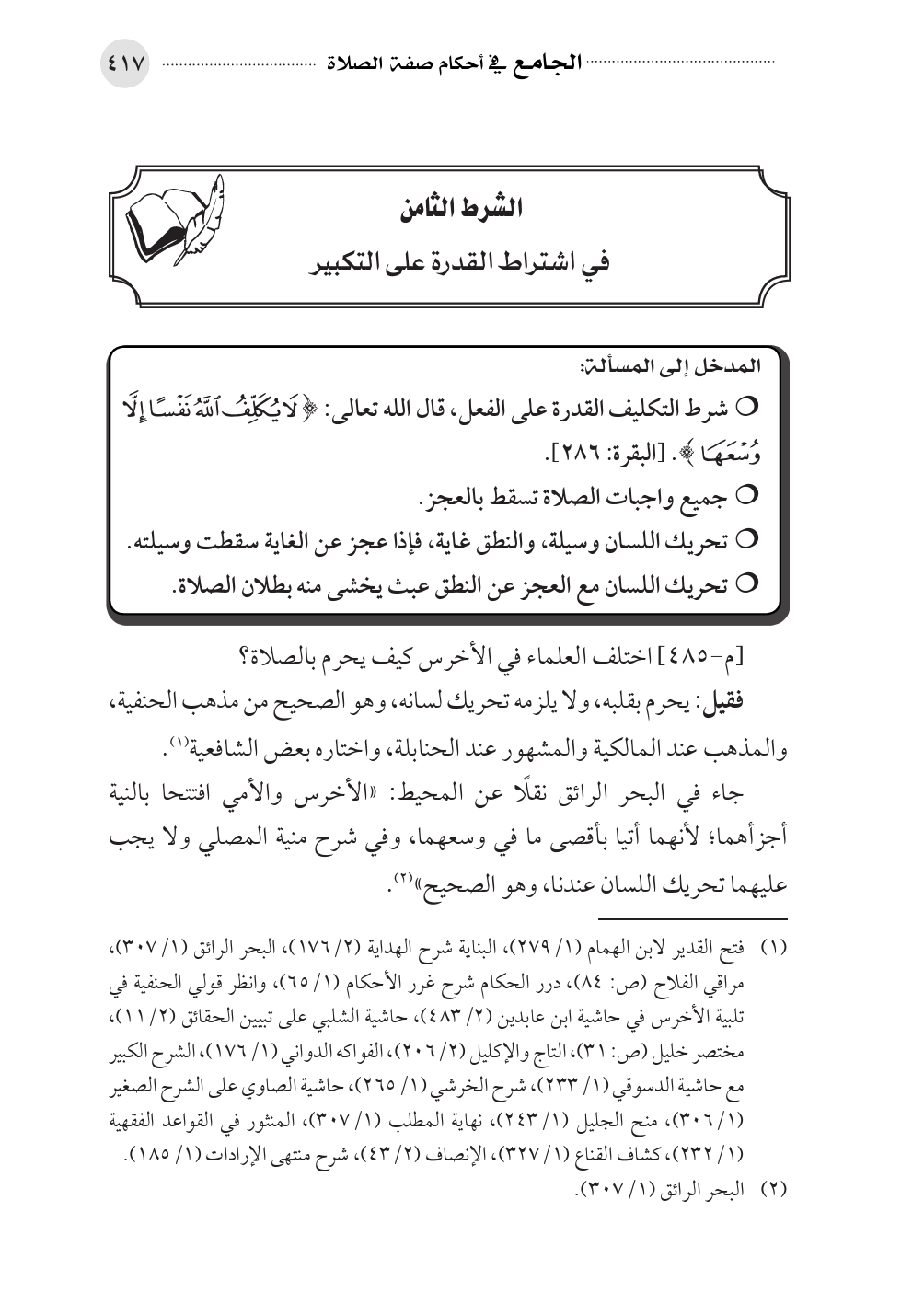 (¬١). فتح القدير لابن الهمام (١/ ٢٧٩)، البناية شرح الهداية (٢/ ١٧٦)، البحر الرائق (١/ ٣٠٧)، مراقي الفلاح (ص: ٨٤)، درر الحكام شرح غرر الأحكام (١/ ٦٥)، وانظر قولي الحنفية في تلبية الأخرس في حاشية ابن عابدين (٢/ ٤٨٣)، حاشية الشلبي على تبيين الحقائق (٢/ ١١)، مختصر خليل (ص: ٣١)، التاج والإكليل (٢/ ٢٠٦)، الفواكه الدواني (١/ ١٧٦)، الشرح الكبير مع حاشية الدسوقي (١/ ٢٣٣)، شرح الخرشي (١/ ٢٦٥)، حاشية الصاوي على الشرح الصغير (١/ ٣٠٦)، منح الجليل (١/ ٢٤٣)، نهاية المطلب (١/ ٣٠٧)، المنثور في القواعد الفقهية (١/ ٢٣٢)، كشاف القناع (١/ ٣٢٧)، الإنصاف (٢/ ٤٣)، شرح منتهى الإرادات (١/ ١٨٥).