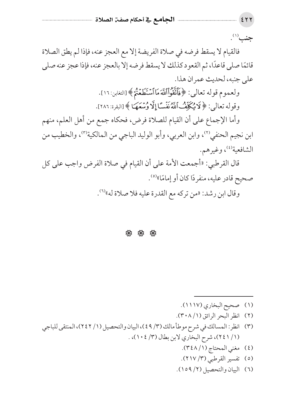 وأما الإجماع على أن القيام للصلاة فرض، فحكاه جمع من أهل العلم، منهم ابن نجيم الحنفي (¬٢)، وابن العربي، وأبو الوليد الباجي من المالكية (¬٣)، والخطيب من الشافعية (¬٤)، وغيرهم.