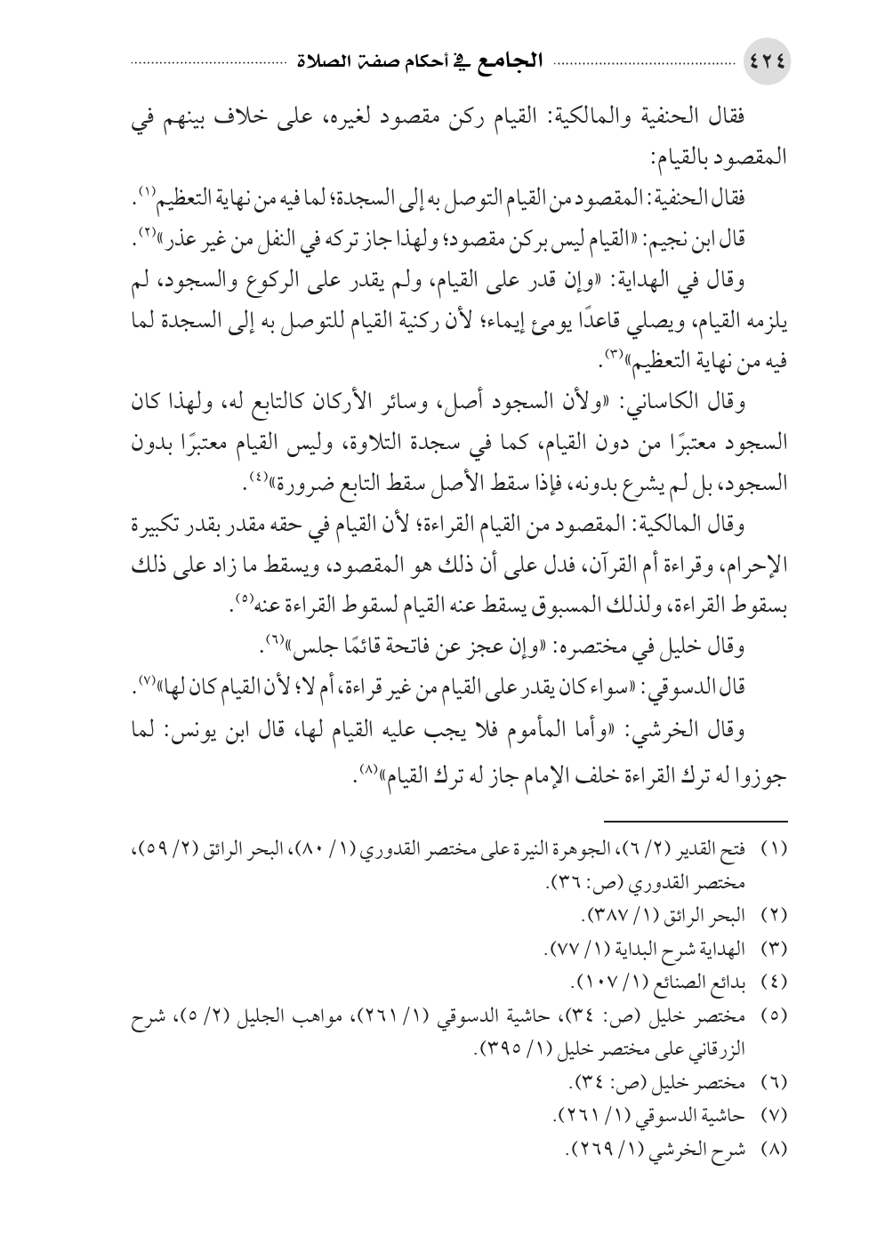 وقال الكاساني: «ولأن السجود أصل، وسائر الأركان كالتابع له، ولهذا كان السجود معتبرًا من دون القيام، كما في سجدة التلاوة، وليس القيام معتبرًا بدون السجود، بل لم يشرع بدونه، فإذا سقط الأصل سقط التابع ضرورة» (¬٤).