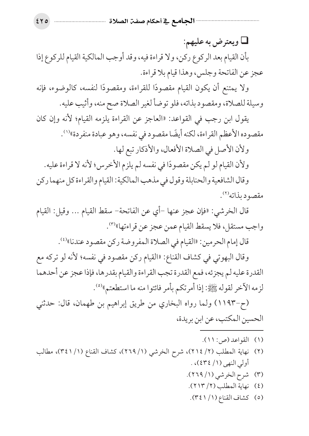 وقال البهوتي في كشاف القناع: «القيام ركن مقصود في نفسه؛ لأنه لو تركه مع القدرة عليه لم يجزئه، فمع القدرة تجب القراءة والقيام بقدرها، فإذا عجز عن أحدهما لزمه الآخر لقوله صلى الله عليه وسلم: إذا أمرتكم بأمر فائتوا منه ما استطعتم» (¬٥).