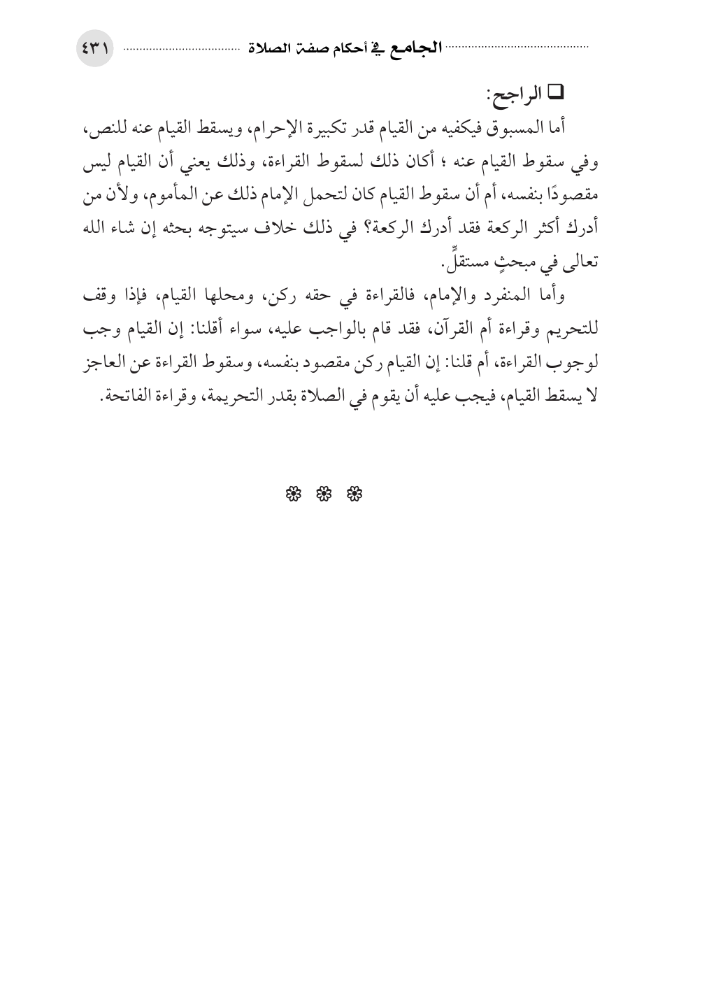 أما المسبوق فيكفيه من القيام قدر تكبيرة الإحرام، ويسقط القيام عنه للنص، وفي سقوط القيام عنه؛ أكان ذلك لسقوط القراءة، وذلك يعني أن القيام ليس مقصودًا بنفسه، أم أن سقوط القيام كان لتحمل الإمام ذلك عن المأموم، ولأن من أدرك أكثر الركعة فقد أدرك الركعة؟ في ذلك خلاف سيتوجه بحثه إن شاء الله تعالى في مبحثٍ مستقلٍّ.
