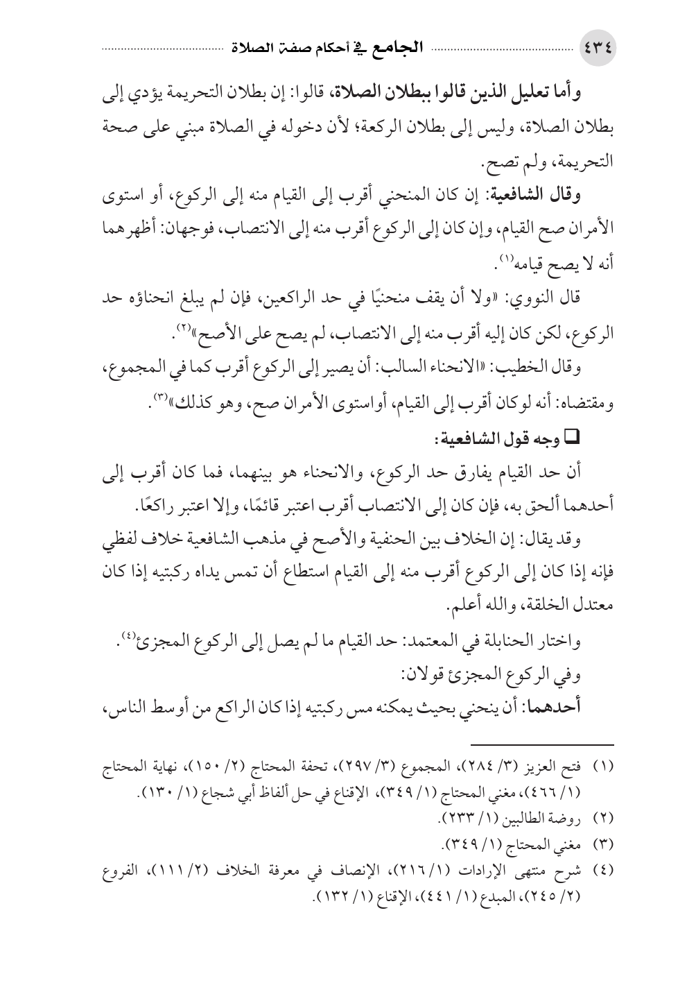 وقال الخطيب: «الانحناء السالب: أن يصير إلى الركوع أقرب كما في المجموع، ومقتضاه: أنه لوكان أقرب إلى القيام، أو استوى الأمران صح، وهو كذلك» (¬٣).