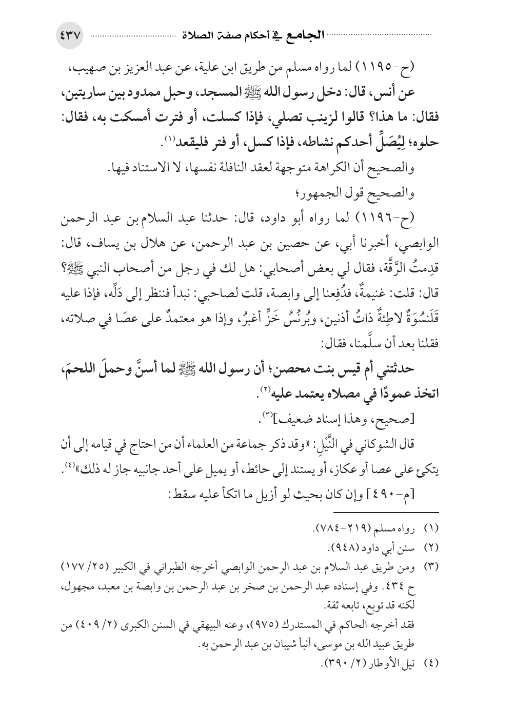 (ح-١١٩٦) لما رواه أبو داود، قال: حدثنا عبد السلام بن عبد الرحمن الوابصي، أخبرنا أبي، عن حصين بن عبد الرحمن، عن هلال بن يساف، قال: قدِمتُ الرَّقَّة، فقال لي بعض أصحابي: هل لك في رجل من أصحاب النبي صلى الله عليه وسلم؟ قال: قلت: غنيمةٌ، فدُفِعنا إلى وابصة، قلت لصاحبي: نبدأ فننظر إلى دَلِّه، فإذا عليه قَلَنسُوَةٌ لاطِئةٌ ذاتُ أذنين، وبُرنُسُ خَزٍّ أغبرُ، وإذا هو معتمدٌ على عصًا في صلاته، فقلنا بعد أن سلَّمنا، فقال: