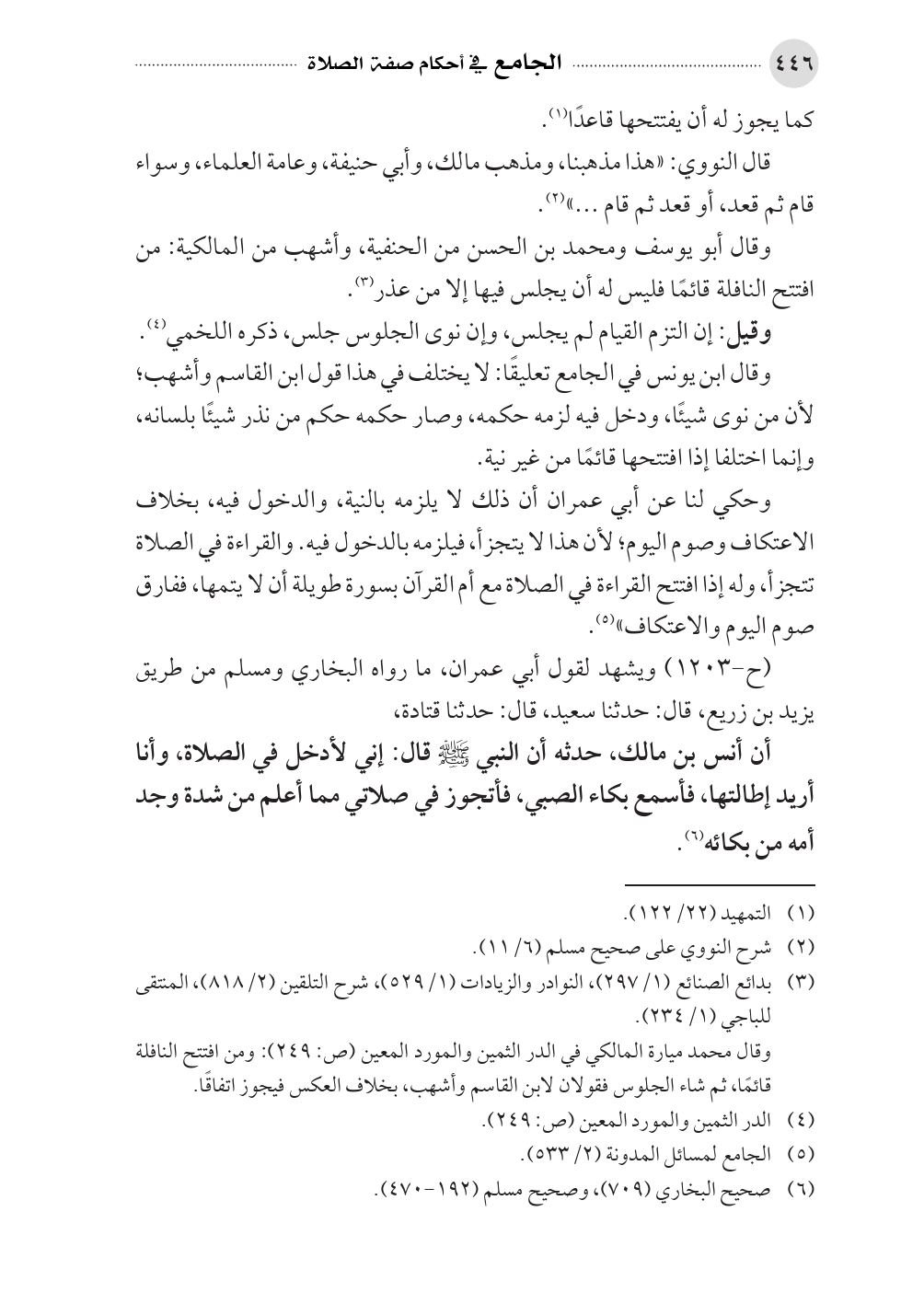 وقال محمد ميارة المالكي في الدر الثمين والمورد المعين (ص: ٢٤٩): ومن افتتح النافلة قائمًا، ثم شاء الجلوس فقولان لابن القاسم وأشهب، بخلاف العكس فيجوز اتفاقًا.