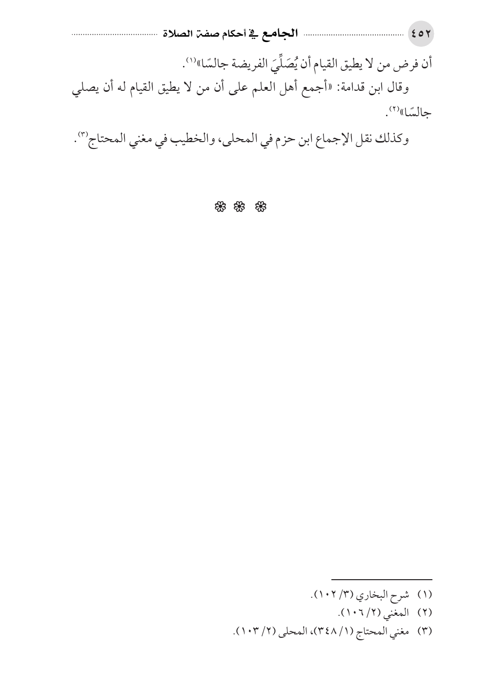 وقال ابن قدامة: «أجمع أهل العلم على أن من لا يطيق القيام له أن يصلي جالسًا» (¬٢).