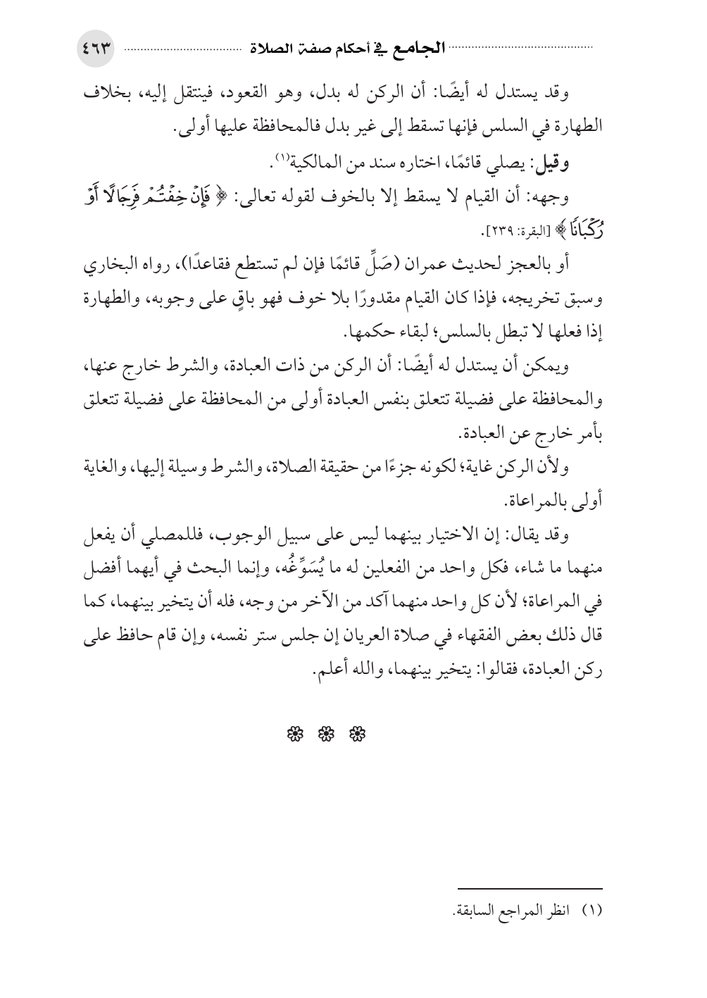 وقد يقال: إن الاختيار بينهما ليس على سبيل الوجوب، فللمصلي أن يفعل منهما ما شاء، فكل واحد من الفعلين له ما يُسَوِّغُه، وإنما البحث في أيهما أفضل في المراعاة؛ لأن كل واحد منهما آكد من الآخر من وجه، فله أن يتخير بينهما، كما قال ذلك بعض الفقهاء في صلاة العريان إن جلس ستر نفسه، وإن قام حافظ على ركن العبادة، فقالوا: يتخير بينهما، والله أعلم.
