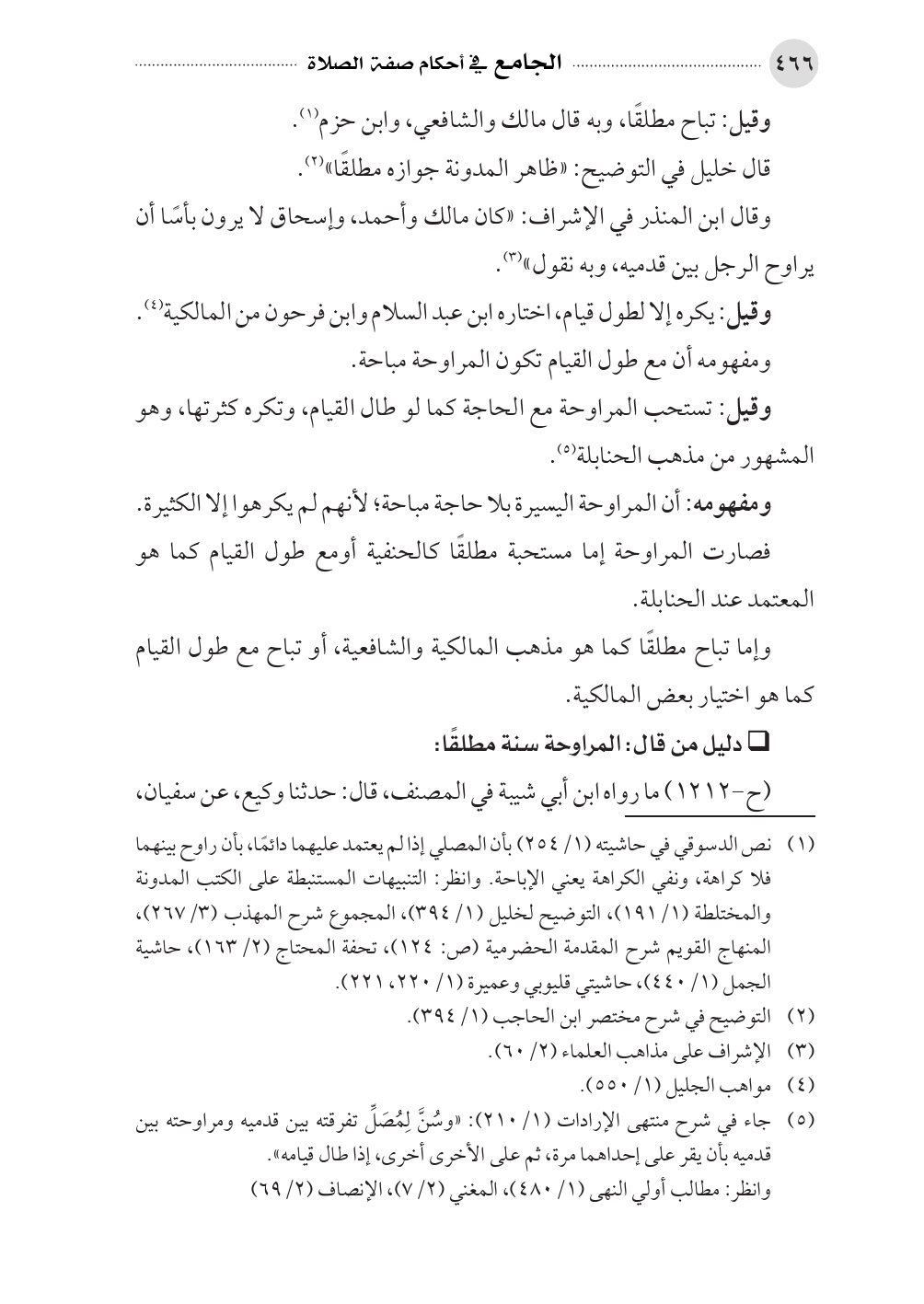 وقال ابن المنذر في الإشراف: «كان مالك وأحمد، وإسحاق لا يرون بأسًا أن يراوح الرجل بين قدميه، وبه نقول» (¬٣).