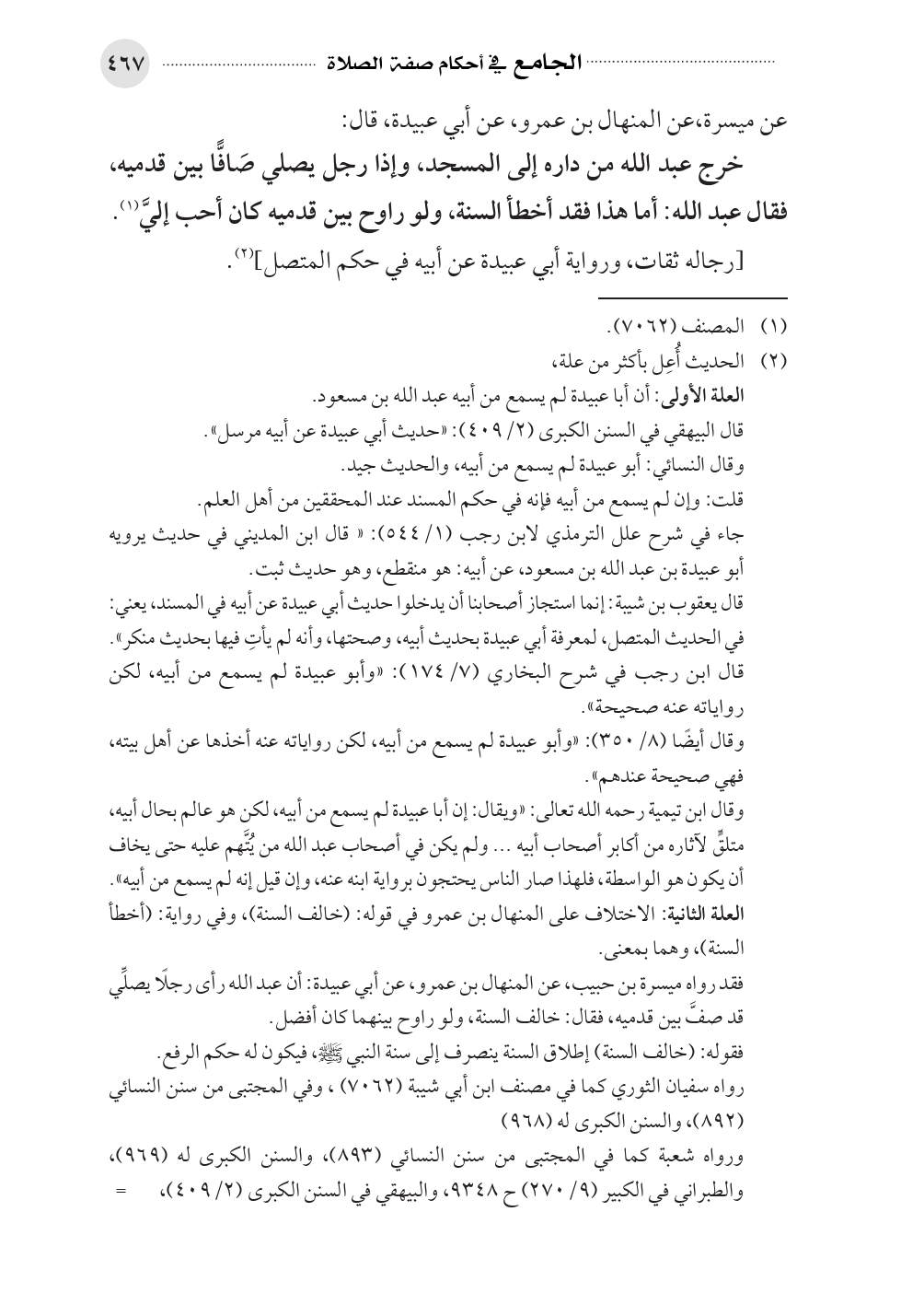 فقد رواه ميسرة بن حبيب، عن المنهال بن عمرو، عن أبي عبيدة: أن عبد الله رأى رجلًا يصلِّي قد صفَّ بين قدميه، فقال: خالف السنة، ولو راوح بينهما كان أفضل.