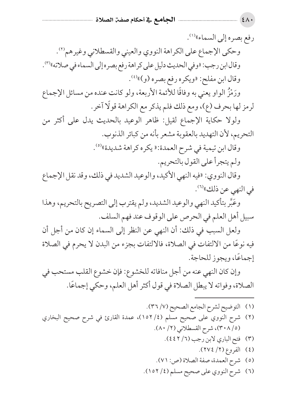 وقال ابن رجب: «وفي الحديث دليل على كراهة رفع بصره إلى السماء في صلاته» (¬٣).