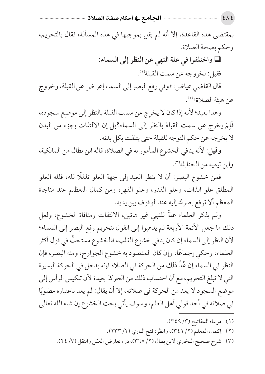 قال القاضي عياض: «وفي رفع البصر إلى السماء إعراض عن القبلة، وخروج عن هيئة الصلاة» (¬٢).