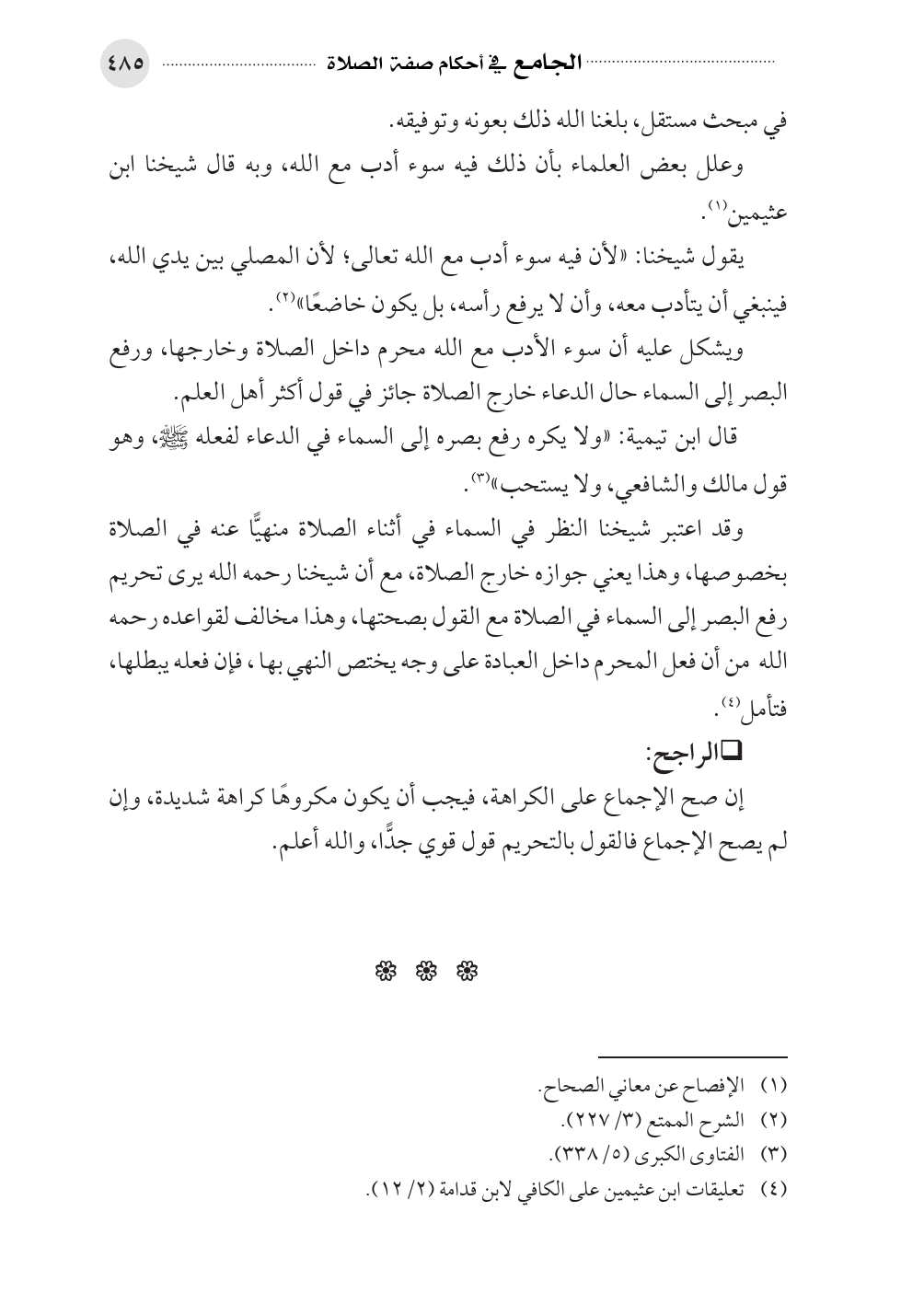 وقد اعتبر شيخنا النظر في السماء في أثناء الصلاة منهيًّا عنه في الصلاة بخصوصها، وهذا يعني جوازه خارج الصلاة، مع أن شيخنا رحمه الله يرى تحريم رفع البصر إلى السماء في الصلاة مع القول بصحتها، وهذا مخالف لقواعده رحمه الله من أن فعل المحرم داخل العبادة على وجه يختص النهي بها، فإن فعله يبطلها، فتأمل (¬٤).