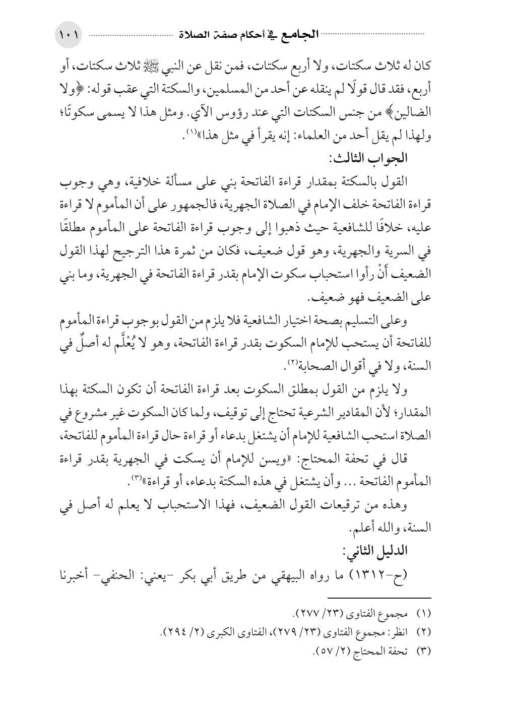 القول بالسكتة بمقدار قراءة الفاتحة بني على مسألة خلافية، وهي وجوب قراءة الفاتحة خلف الإمام في الصلاة الجهرية، فالجمهور على أن المأموم لا قراءة عليه، خلافًا للشافعية حيث ذهبوا إلى وجوب قراءة الفاتحة على المأموم مطلقًا في السرية والجهرية، وهو قول ضعيف، فكان من ثمرة هذا الترجيح لهذا القول الضعيف أَنْ رأوا استحباب سكوت الإمام بقدر قراءة الفاتحة في الجهرية، وما بني على الضعيف فهو ضعيف.
