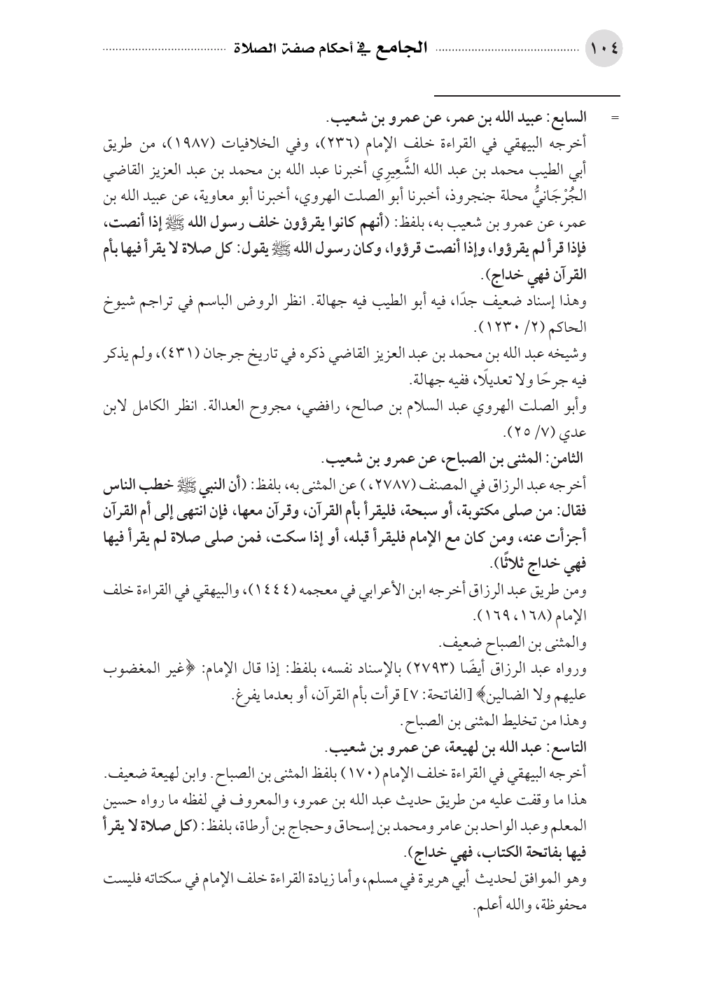 أخرجه البيهقي في القراءة خلف الإمام (٢٣٦)، وفي الخلافيات (١٩٨٧)، من طريق أبي الطيب محمد بن عبد الله الشَّعِيرِي أخبرنا عبد الله بن محمد بن عبد العزيز القاضي الجُرْجَانيُّ محلة جنجروذ، أخبرنا أبو الصلت الهروي، أخبرنا أبو معاوية، عن عبيد الله بن عمر، عن عمرو بن شعيب به، بلفظ: (أنهم كانوا يقرؤون خلف رسول الله صلى الله عليه وسلم إذا أنصت، فإذا قرأ لم يقرؤوا، وإذا أنصت قرؤوا، وكان رسول الله صلى الله عليه وسلم يقول: كل صلاة لا يقرأ فيها بأم القرآن فهي خداج).