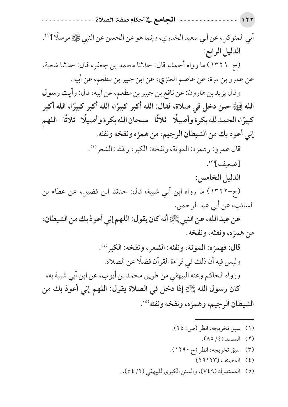 كان رسول الله صلى الله عليه وسلم إذا دخل في الصلاة يقول: اللهم إني أعوذ بك من الشيطان الرجيم، وهمزه، ونفخه ونفثه (¬٥).