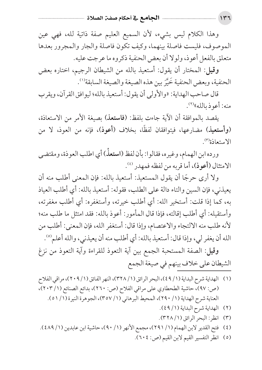 وهذا الكلام ليس بشيء، لأن السميع العليم صفة ذاتية لله، فهي عين الموصوف، فليست فاصلة بينهما، وكيف تكون فاصلة والجار والمجرور بعدها متعلق بالفعل أعوذ، ولولا أن بعض الحنفية ذكروه ما عرجت عليه.