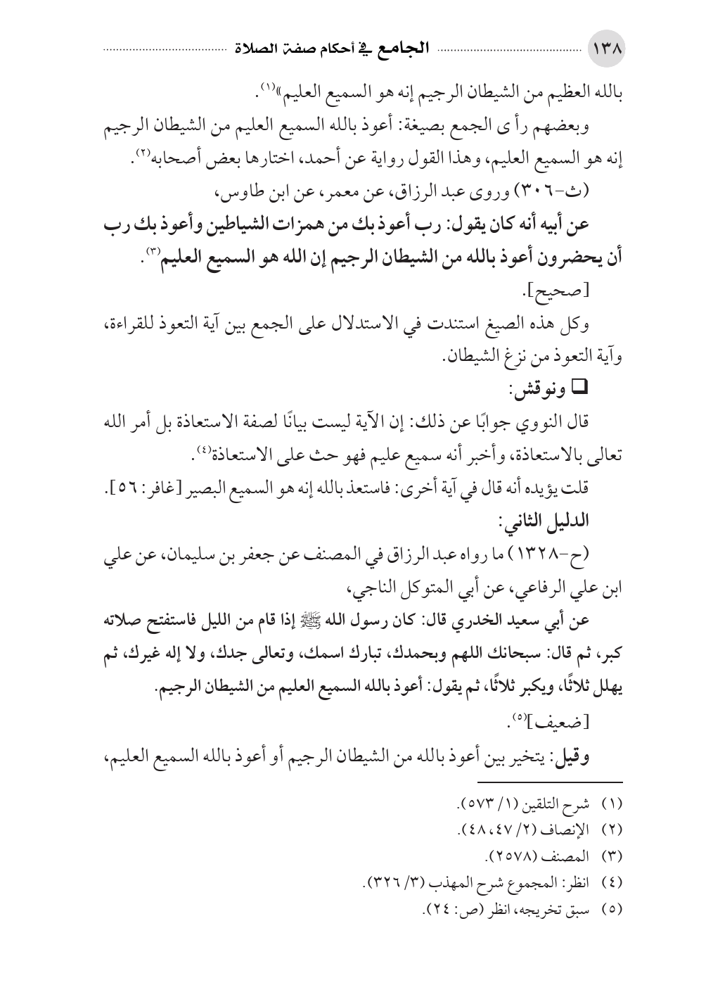 وبعضهم رأ ى الجمع بصيغة: أعوذ بالله السميع العليم من الشيطان الرجيم إنه هو السميع العليم، وهذا القول رواية عن أحمد، اختارها بعض أصحابه (¬٢).
