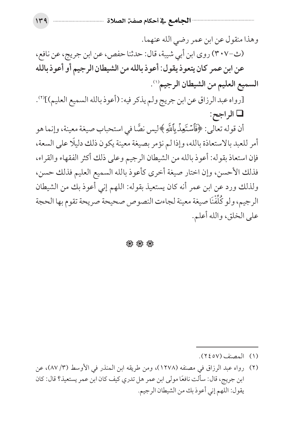 (¬٢). رواه عبد الرزاق في مصنفه (١٢٧٨)، ومن طريقه ابن المنذر في الأوسط (٣/ ٨٧)، عن ابن جريج، قال: سألت نافعًا مولى ابن عمر هل تدري كيف كان ابن عمر يستعيذ؟ قال: كان يقول: اللهم إني أعوذ بك من الشيطان الرجيم.