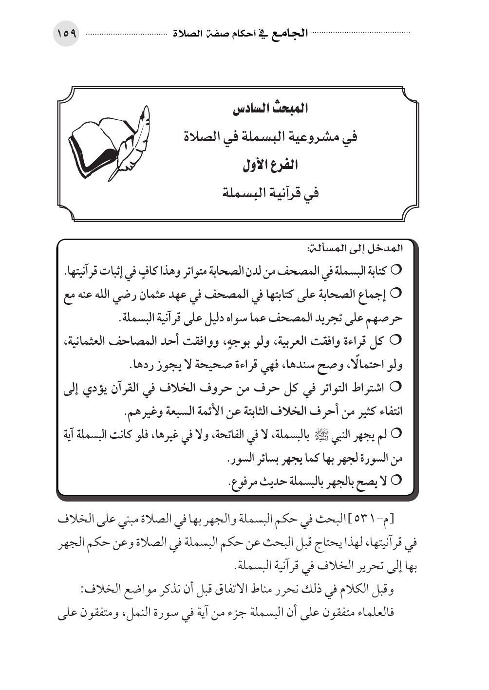 [م-٥٣١] البحث في حكم البسملة والجهر بها في الصلاة مبني على الخلاف في قرآنيتها، لهذا يحتاج قبل البحث عن حكم البسملة في الصلاة وعن حكم الجهر بها إلى تحرير الخلاف في قرآنية البسملة.