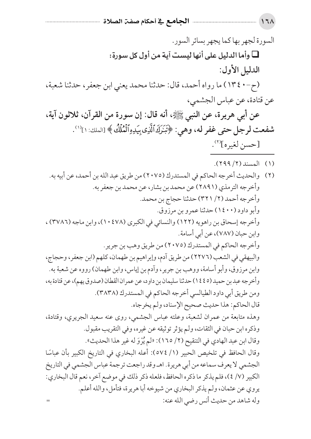 وقال الحافظ في تلخيص الحبير (١/ ٥٧٤): أعله البخاري في التاريخ الكبير بأن عباسًا الجشمي لا يعرف سماعه من أبي هريرة. اهـ وقد راجعت ترجمة عباس الجشمي في التاريخ الكبير (٧/ ٤)، فلم يذكر ما ذكره الحافظ، فلعله ذكر ذلك في موضع آخر، نعم قال البخاري: يروي عن عثمان، ولم يذكر البخاري من شيوخه أبا هريرة، فتأمل، والله أعلم.