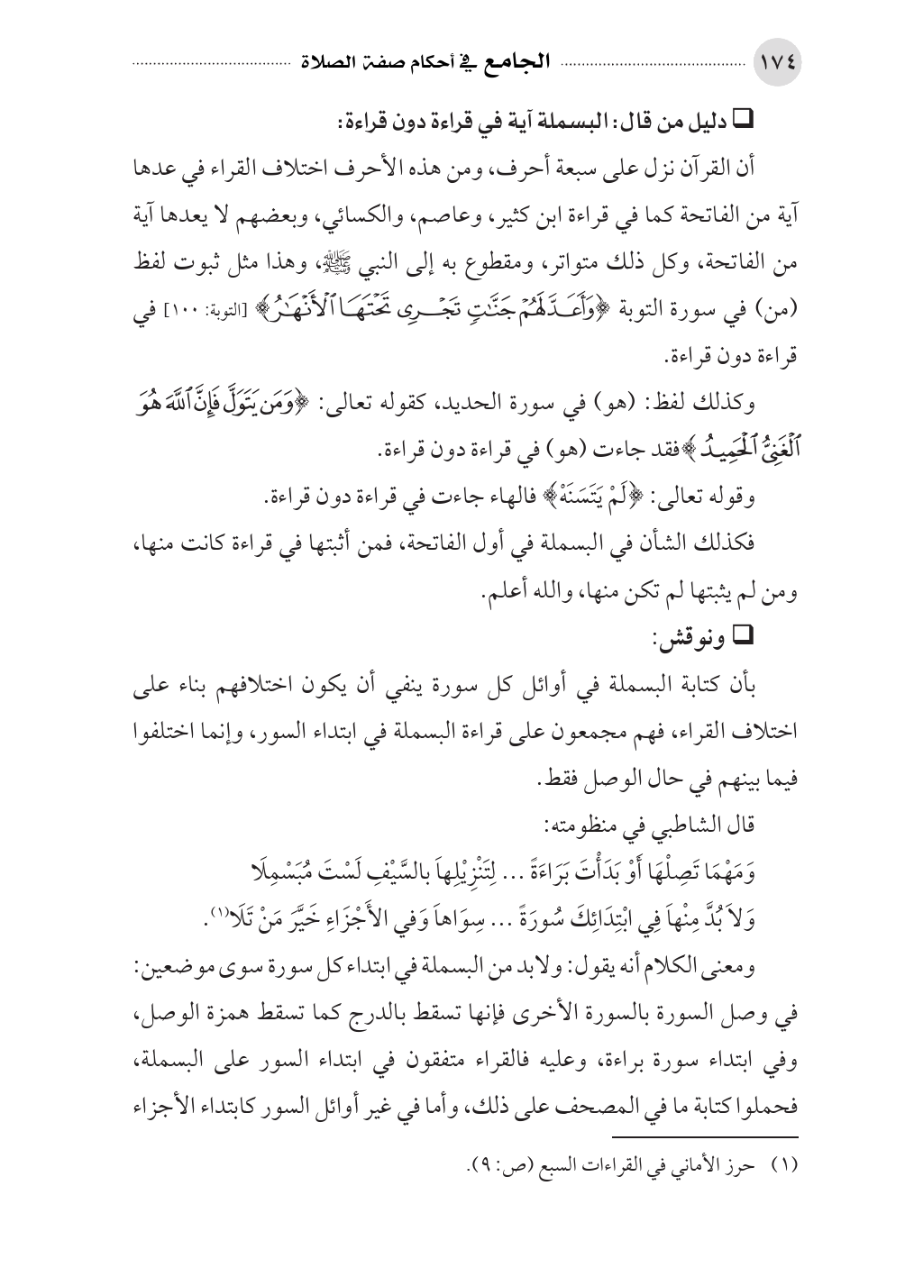وَلَا بُدَّ مِنْهاَ فِي ابْتِدَائِكَ سُورَةً ... سِوَاهاَ وَفي الأَجْزَاءِ خَيَّرَ مَنْ تَلَا (¬١).