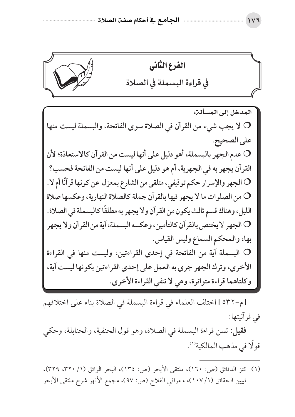 [م-٥٣٢] اختلف العلماء في قراءة البسملة في الصلاة بناء على اختلافهم في قرآنيتها: