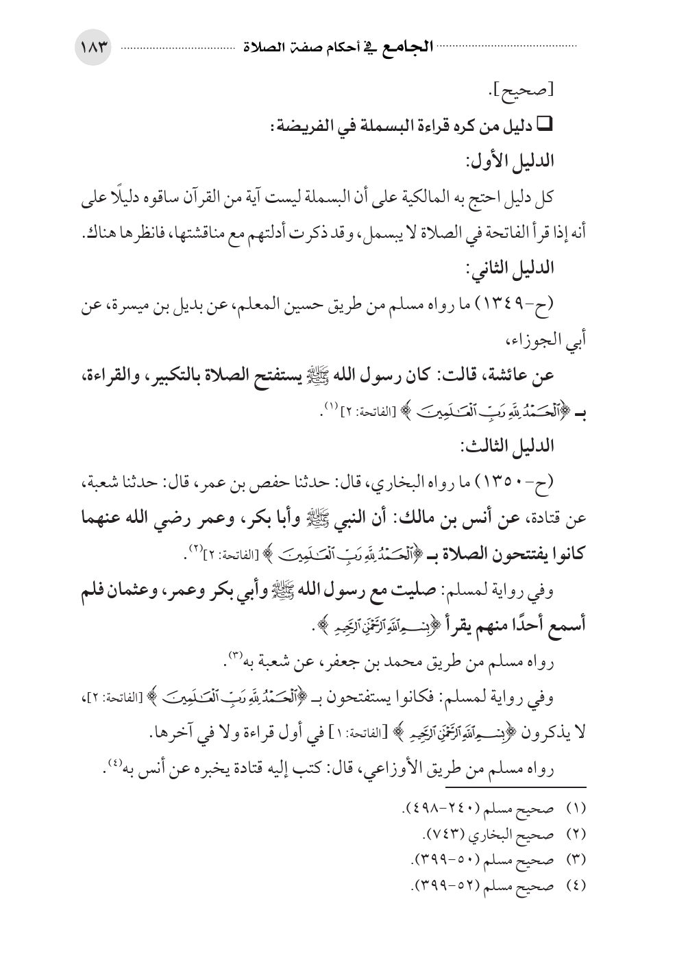 وفي رواية لمسلم: فكانوا يستفتحون بـ {الْحَمْدُ للّهِ رَبِّ الْعَالَمِين} [الفاتحة: ٢]، لا يذكرون {بِسْمِ اللّهِ الرَّحْمَنِ الرَّحِيم} [الفاتحة: ١] في أول قراءة ولا في آخرها.