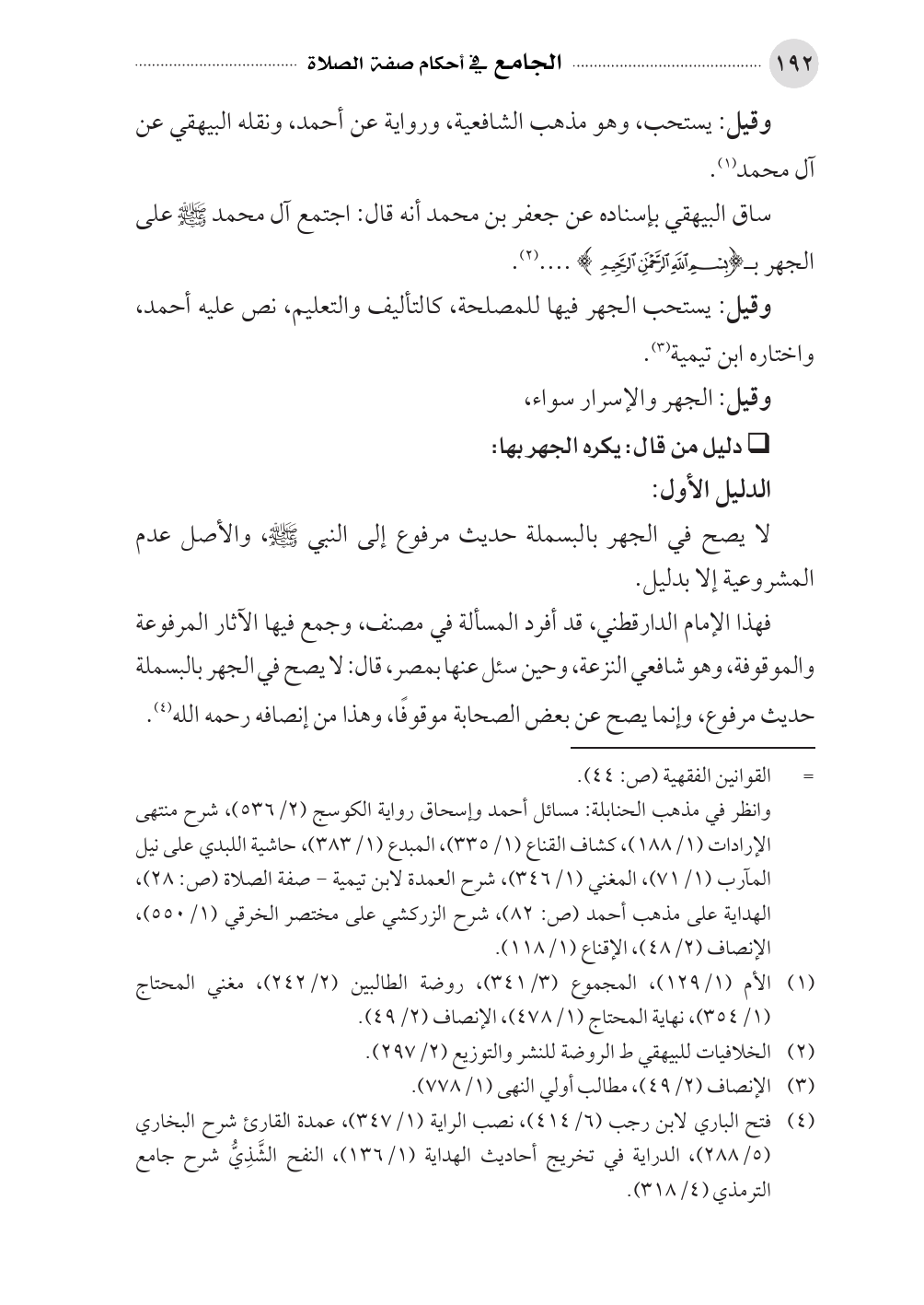 فهذا الإمام الدارقطني، قد أفرد المسألة في مصنف، وجمع فيها الآثار المرفوعة والموقوفة، وهو شافعي النزعة، وحين سئل عنها بمصر، قال: لا يصح في الجهر بالبسملة حديث مرفوع، وإنما يصح عن بعض الصحابة موقوفًا، وهذا من إنصافه رحمه الله (¬٤).