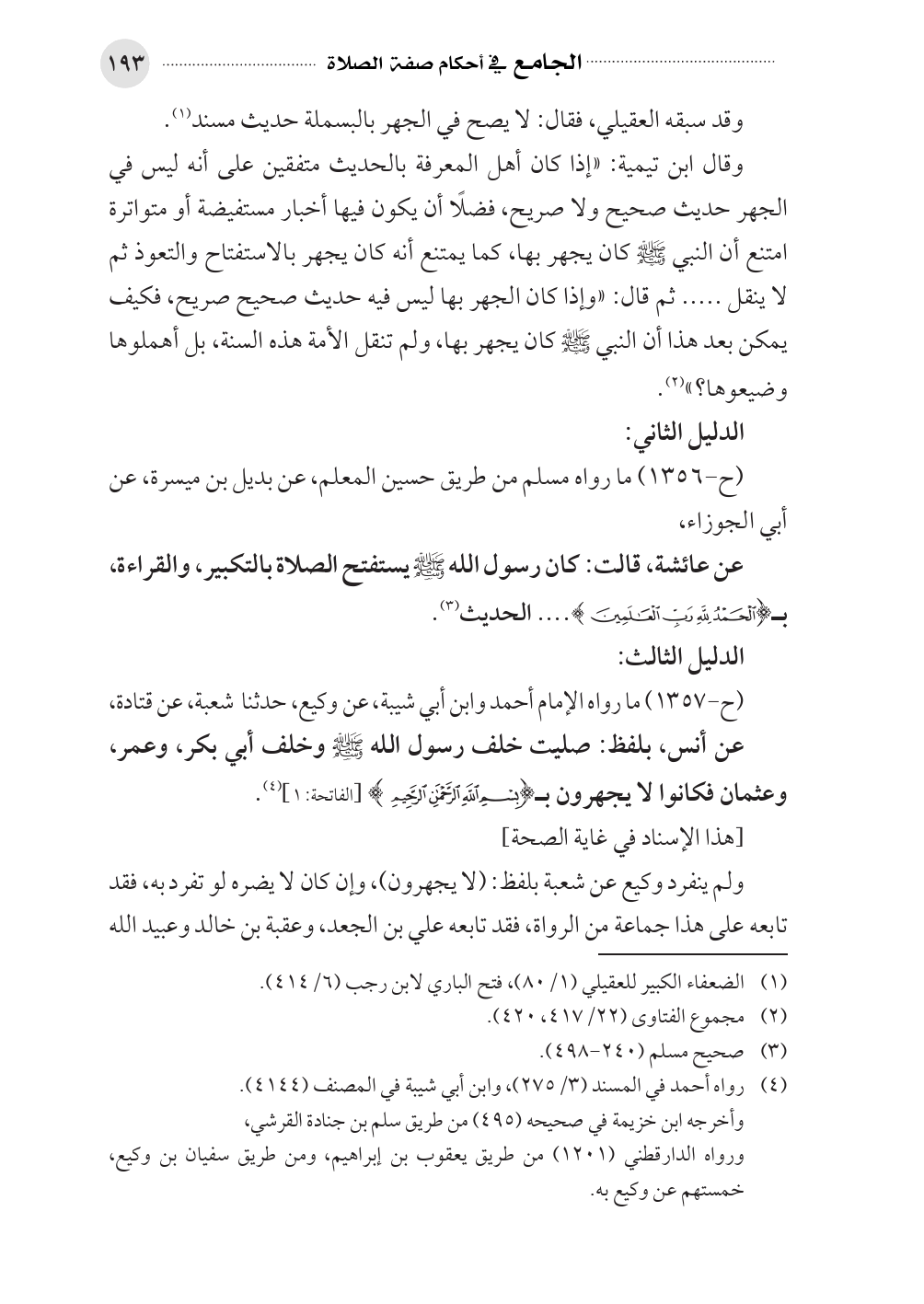 وقال ابن تيمية: «إذا كان أهل المعرفة بالحديث متفقين على أنه ليس في الجهر حديث صحيح ولا صريح، فضلًا أن يكون فيها أخبار مستفيضة أو متواترة امتنع أن النبي صلى الله عليه وسلم كان يجهر بها، كما يمتنع أنه كان يجهر بالاستفتاح والتعوذ ثم لا ينقل ..... ثم قال: «وإذا كان الجهر بها ليس فيه حديث صحيح صريح، فكيف يمكن بعد هذا أن النبي صلى الله عليه وسلم كان يجهر بها، ولم تنقل الأمة هذه السنة، بل أهملوها وضيعوها؟» (¬٢).