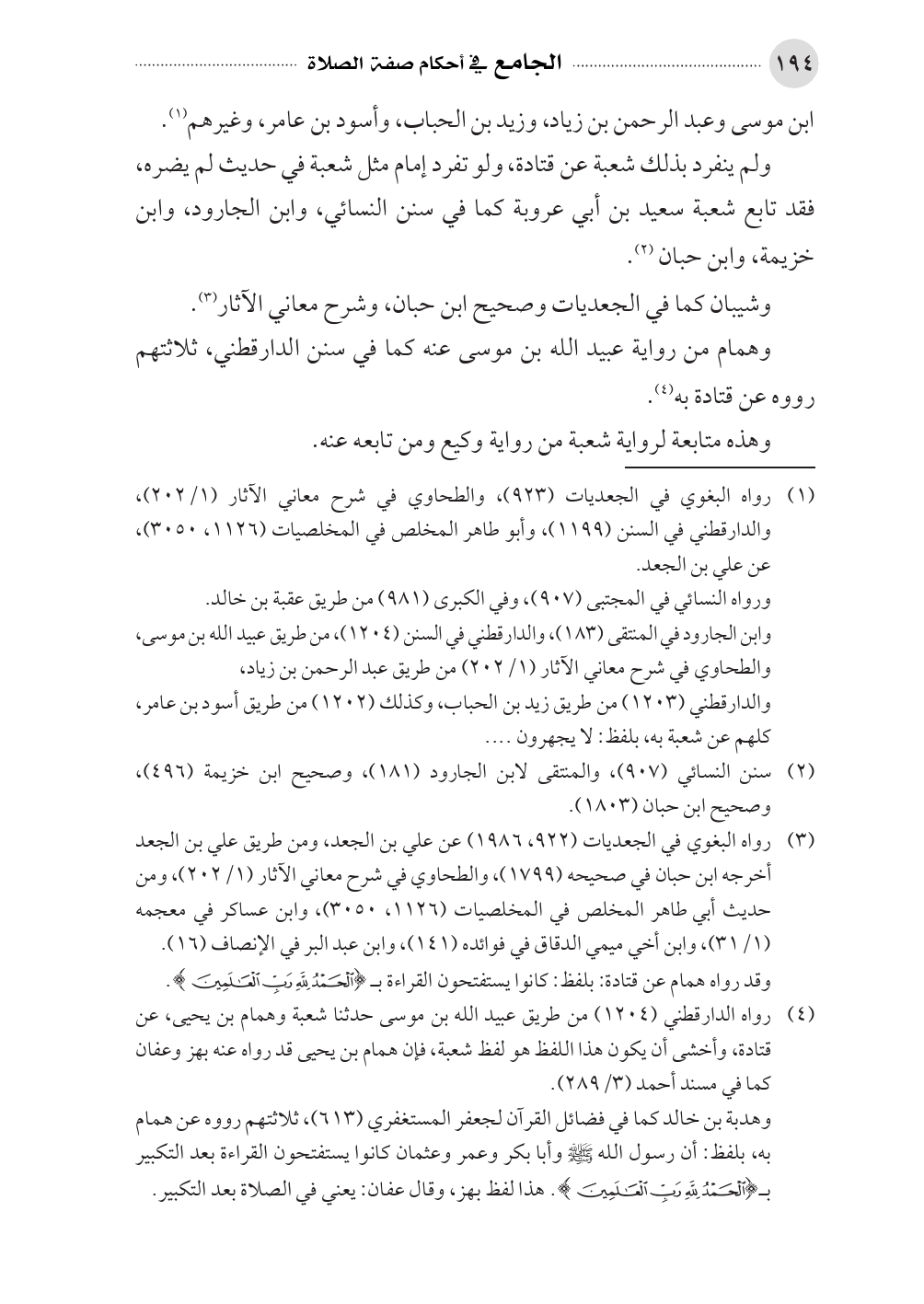 وهدبة بن خالد كما في فضائل القرآن لجعفر المستغفري (٦١٣)، ثلاثتهم رووه عن همام به، بلفظ: أن رسول الله صلى الله عليه وسلم وأبا بكر وعمر وعثمان كانوا يستفتحون القراءة بعد التكبير بـ {لِلَّهِ رَبِّ الْعَالَمِينَ}. هذا لفظ بهز، وقال عفان: يعني في الصلاة بعد التكبير.
