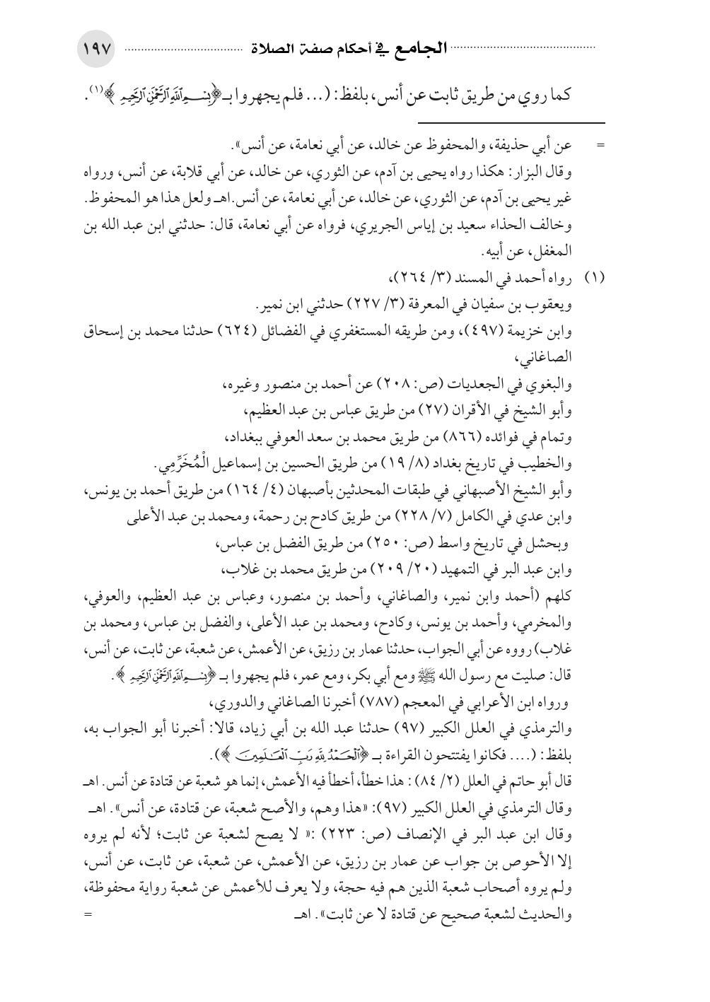 كلهم (أحمد وابن نمير، والصاغاني، وأحمد بن منصور، وعباس بن عبد العظيم، والعوفي، والمخرمي، وأحمد بن يونس، وكادح، ومحمد بن عبد الأعلى، والفضل بن عباس، ومحمد بن غلاب) رووه عن أبي الجواب، حدثنا عمار بن رزيق، عن الأعمش، عن شعبة، عن ثابت، عن أنس، قال: صليت مع رسول الله صلى الله عليه وسلم ومع أبي بكر، ومع عمر، فلم يجهروا بـ {بِسْمِ اللَّهِ الرَّحْمَنِ الرَّحِيمِ}.