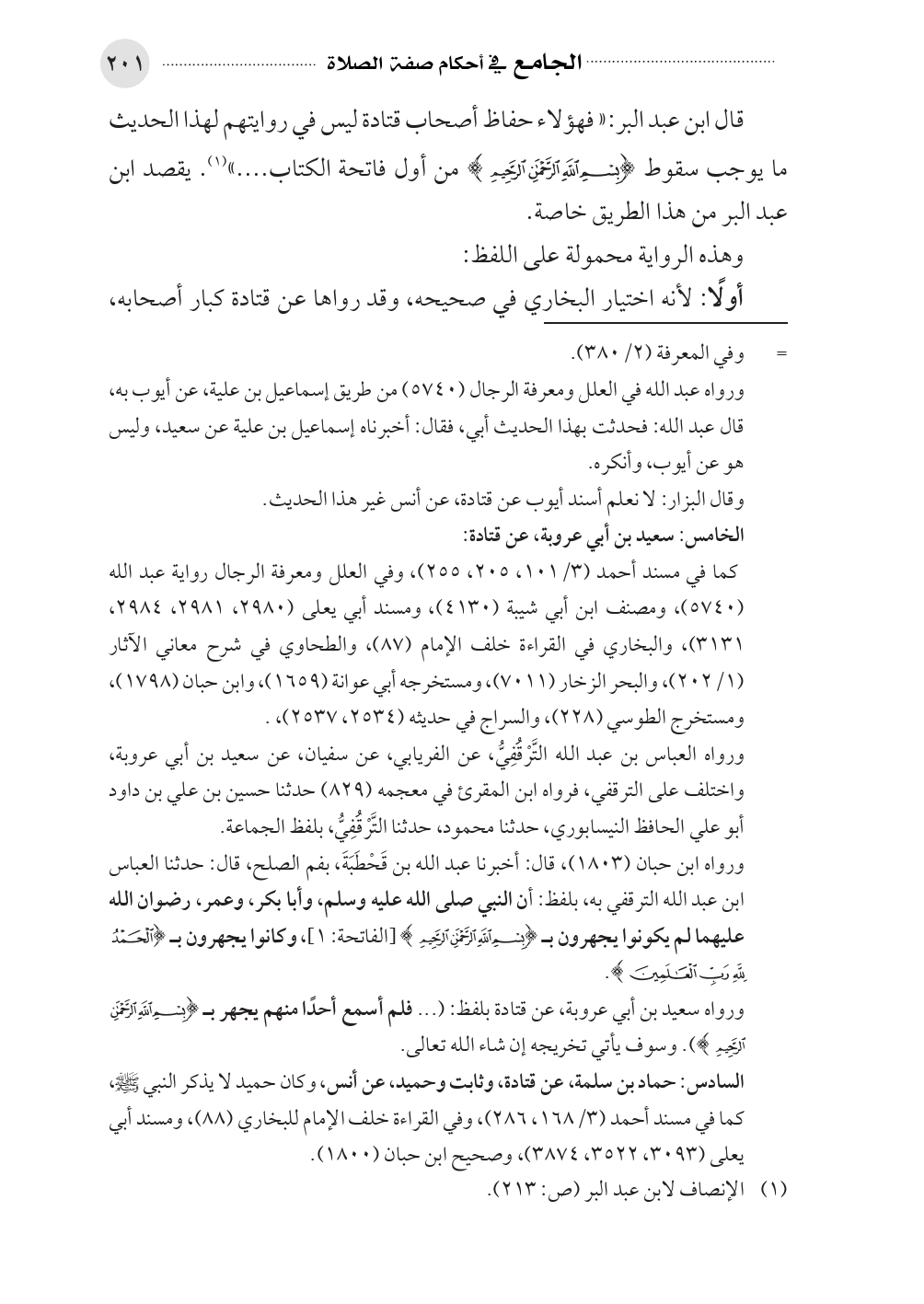 قال ابن عبد البر: «فهؤلاء حفاظ أصحاب قتادة ليس في روايتهم لهذا الحديث ما يوجب سقوط {بسْمِ اللّهِ الرَّحْمَنِ الرَّحِيم} من أول فاتحة الكتاب .... » (¬١). يقصد ابن عبد البر من هذا الطريق خاصة.