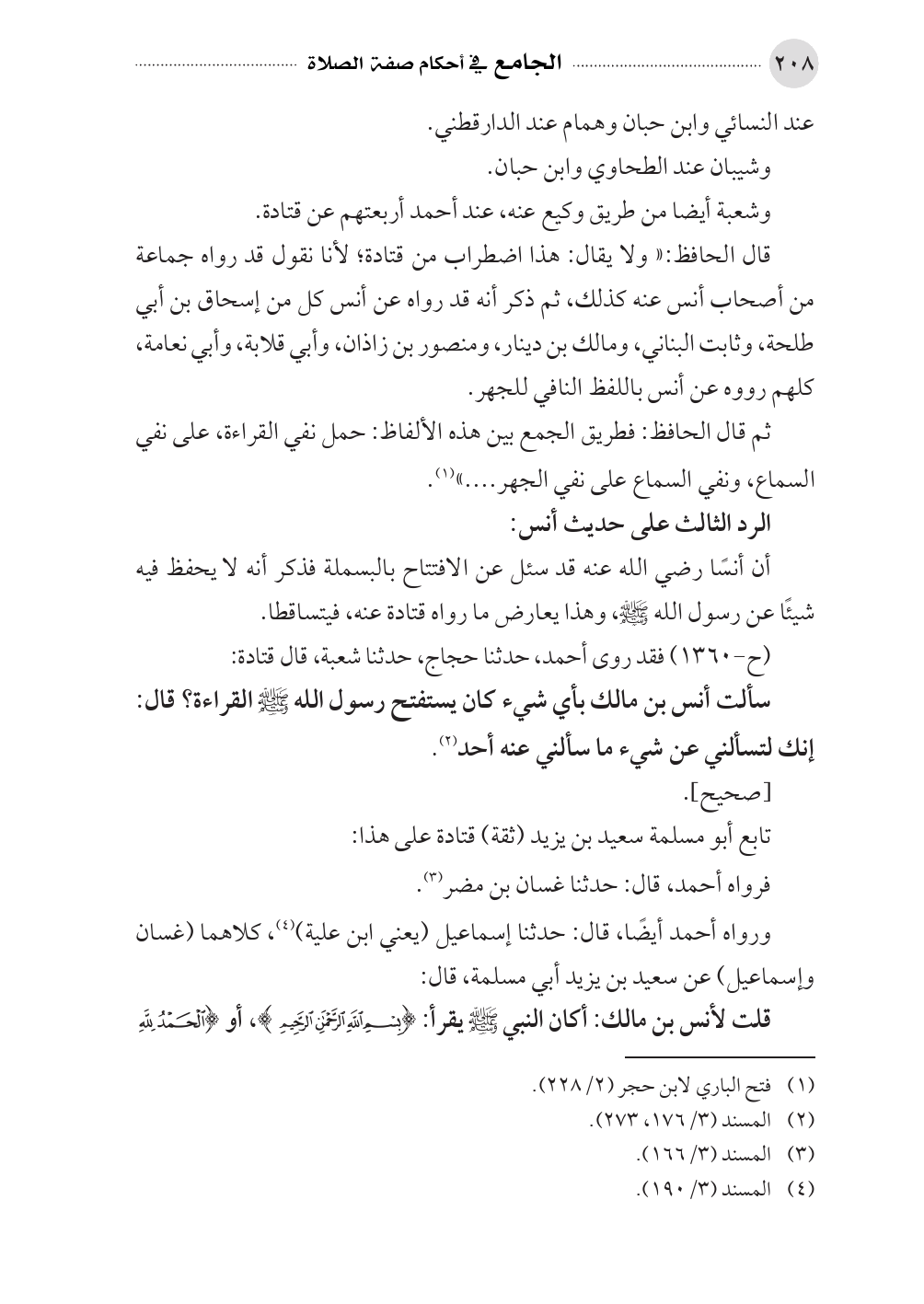 قال الحافظ: «ولا يقال: هذا اضطراب من قتادة؛ لأنا نقول قد رواه جماعة من أصحاب أنس عنه كذلك، ثم ذكر أنه قد رواه عن أنس كل من إسحاق بن أبي طلحة، وثابت البناني، ومالك بن دينار، ومنصور بن زاذان، وأبي قلابة، وأبي نعامة، كلهم رووه عن أنس باللفظ النافي للجهر.
