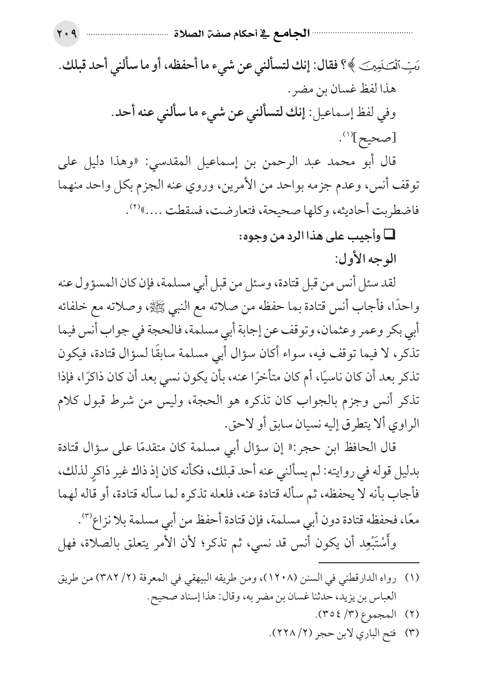 لقد سئل أنس من قبل قتادة، وسئل من قبل أبي مسلمة، فإن كان المسؤول عنه واحدًا، فأجاب أنس قتادة بما حفظه من صلاته مع النبي صلى الله عليه وسلم، وصلاته مع خلفائه أبي بكر وعمر وعثمان، وتوقف عن إجابة أبي مسلمة، فالحجة في جواب أنس فيما تذكر، لا فيما توقف فيه، سواء أكان سؤال أبي مسلمة سابقًا لسؤال قتادة، فيكون تذكر بعد أن كان ناسيًا، أم كان متأخرًا عنه، بأن يكون نسي بعد أن كان ذاكرًا، فإذا تذكر أنس وجزم بالجواب كان تذكره هو الحجة، وليس من شرط قبول كلام الراوي ألا يتطرق إليه نسيان سابق أو لاحق.