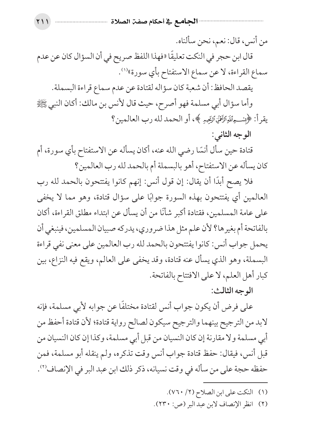 فلا يصح أبدًا أن يقال: إن قول أنس: إنهم كانوا يفتتحون بالحمد لله رب العالمين أي يفتتحون بهذه السورة جوابًا على سؤال قتادة، وهو مما لا يخفى على عامة المسلمين، فقتادة أكبر شأنًا من أن يسأل عن ابتداء مطلق القراءة، أكان بالفاتحة أم بغيرها؟ لأن علم مثل هذا ضروري، يدركه صبيان المسلمين، فينبغي أن يحمل جواب أنس: كانوا يفتتحون بالحمد لله رب العالمين على معنى نفي قراءة البسملة، وهو الذي يسأل عنه قتادة، وقد يخفى على العالم، ويقع فيه النزاع، بين كبار أهل العلم، لا على الافتتاح بالفاتحة.