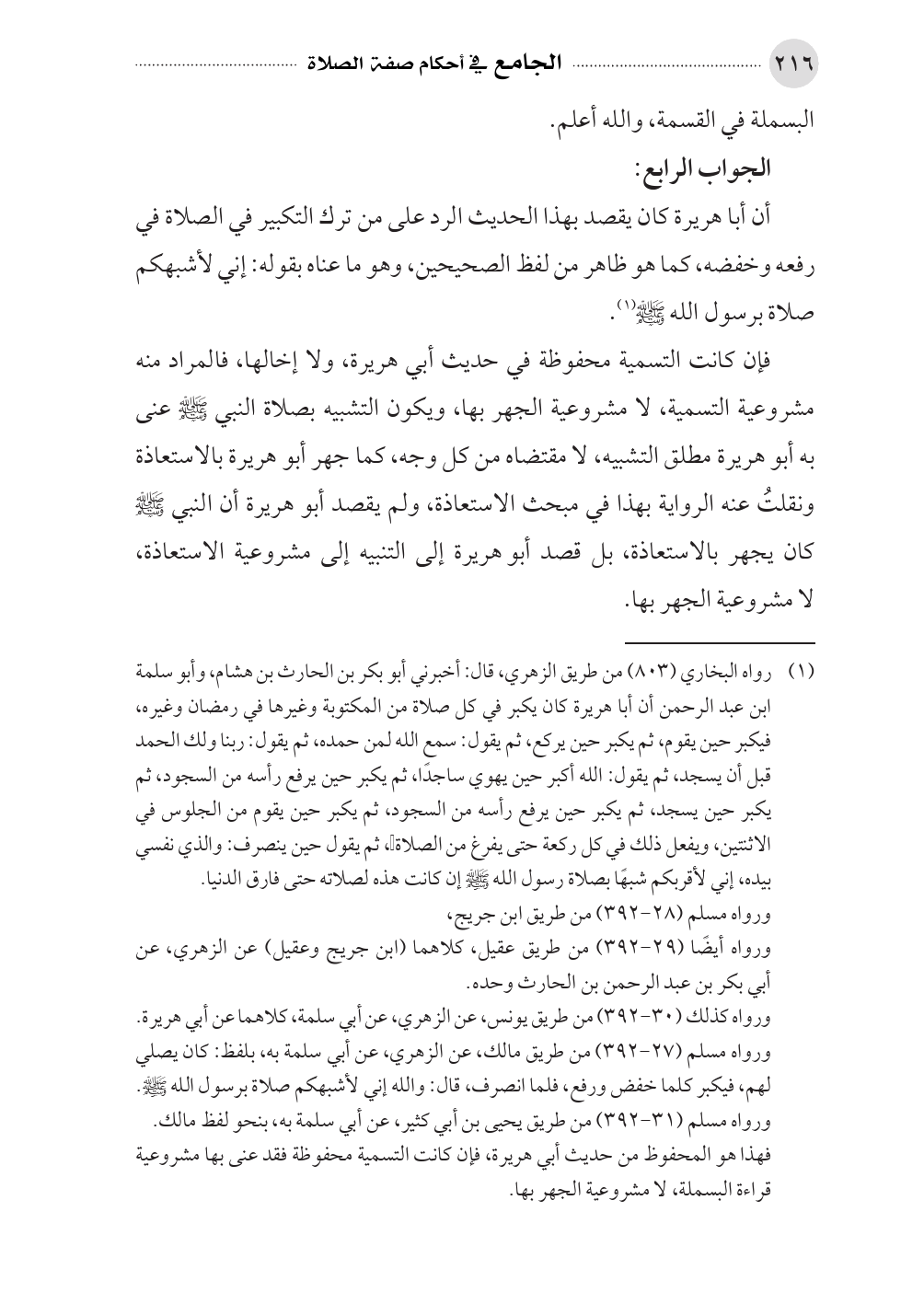 فإن كانت التسمية محفوظة في حديث أبي هريرة، ولا إخالها، فالمراد منه مشروعية التسمية، لا مشروعية الجهر بها، ويكون التشبيه بصلاة النبي صلى الله عليه وسلم عنى به أبو هريرة مطلق التشبيه، لا مقتضاه من كل وجه، كما جهر أبو هريرة بالاستعاذة ونقلتُ عنه الرواية بهذا في مبحث الاستعاذة، ولم يقصد أبو هريرة أن النبي صلى الله عليه وسلم كان يجهر بالاستعاذة، بل قصد أبو هريرة إلى التنبيه إلى مشروعية الاستعاذة، لا مشروعية الجهر بها.