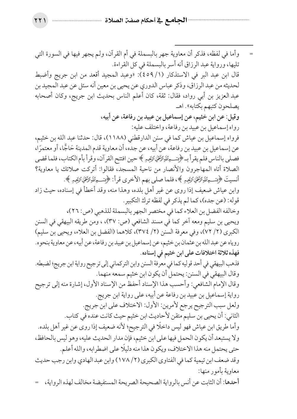 = وأما في لفظه، فذكر أن معاوية جهر بالبسملة في أم القرآن، ولم يجهر فيها في السورة التي تليها، ورواية عبد الرزاق أنه أسر بالبسملة في كل القراءة.