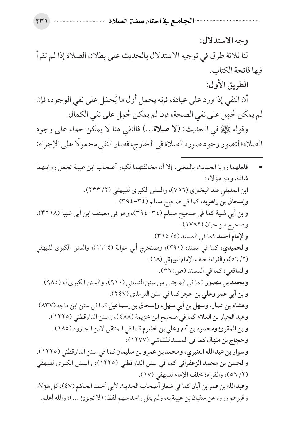 لنا ثلاثة طرق في توجيه الاستدلال بالحديث على بطلان الصلاة إذا لم تقرأ فيها فاتحة الكتاب.