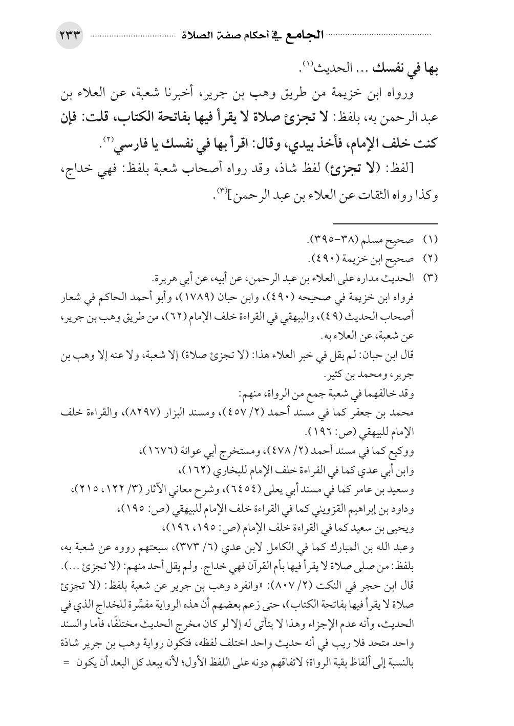 قال ابن حبان: لم يقل في خبر العلاء هذا: (لا تجزئ صلاة) إلا شعبة، ولا عنه إلا وهب بن جرير، ومحمد بن كثير.