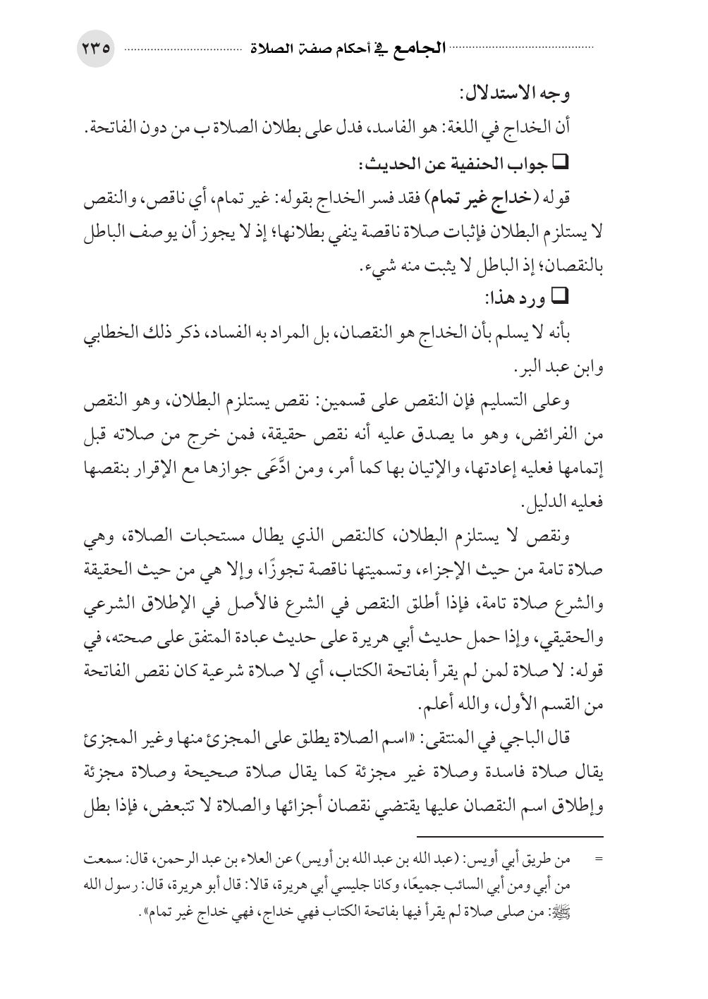 قوله (خداج غير تمام) فقد فسر الخداج بقوله: غير تمام، أي ناقص، والنقص لا يستلزم البطلان فإثبات صلاة ناقصة ينفي بطلانها؛ إذ لا يجوز أن يوصف الباطل بالنقصان؛ إذ الباطل لا يثبت منه شيء.