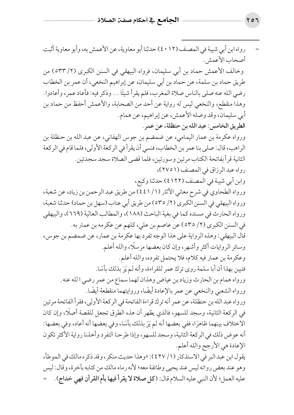 ورواه عبد الله بن حنظلة، عن عمر أنه ترك قراءة الفاتحة في الركعة الأولى، فقرأ الفاتحة مرتين في الركعة الثانية، وسجد للسهو، فالذي يظهر أن هذه الطرق تجعل للقصة أصلًا، وإن كان الاختلاف بينهما ظاهرًا، ففي بعضها أنه لم يَرَ بذلك بأسًا، وفي بعضها أنه أعاد، وفي بعضها: أنه عوض ذلك في الركعة الثانية، وسجد للسهو، وإذا طرحنا التفرد وأخذنا رواية الأكثر تكون الإعادة هي الأرجح والله أعلم.