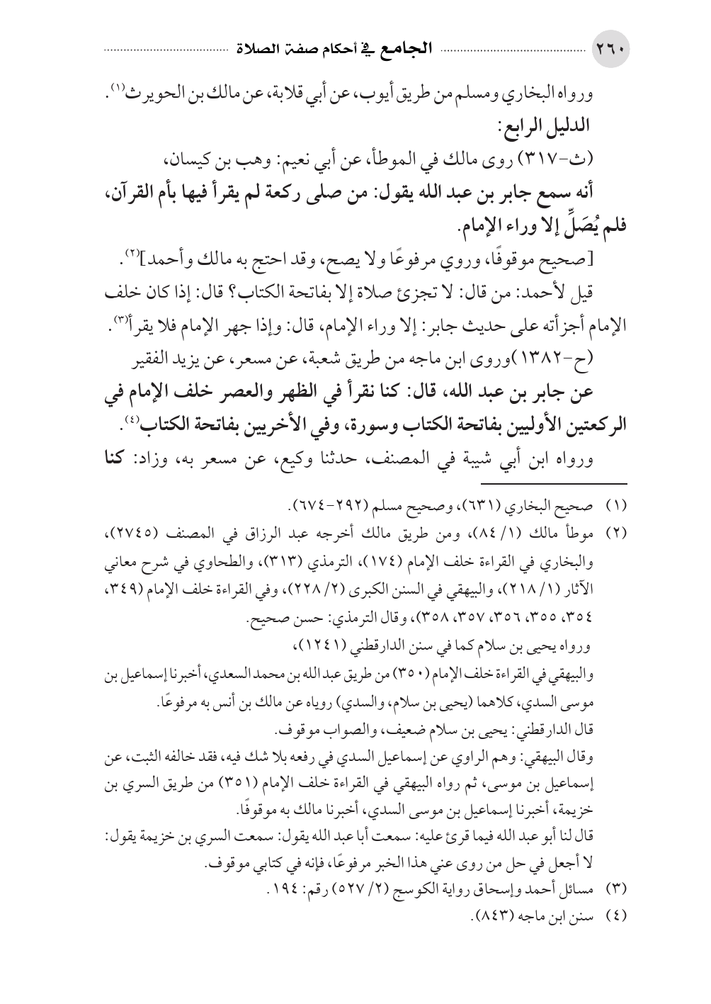 عن جابر بن عبد الله، قال: كنا نقرأ في الظهر والعصر خلف الإمام في الركعتين الأوليين بفاتحة الكتاب وسورة، وفي الأخريين بفاتحة الكتاب (¬٤).