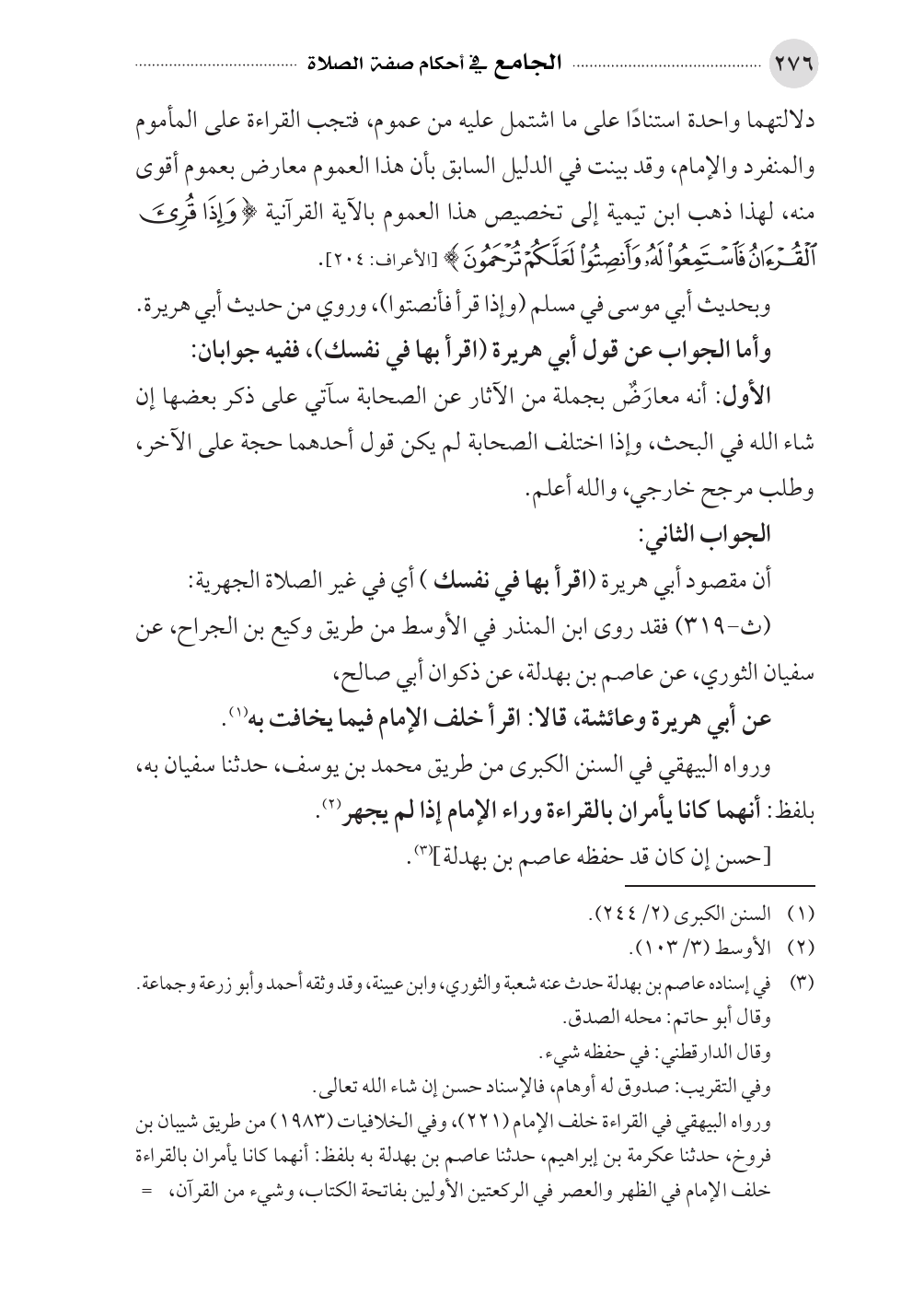 وأما الجواب عن قول أبي هريرة (اقرأ بها في نفسك)، ففيه جوابان: